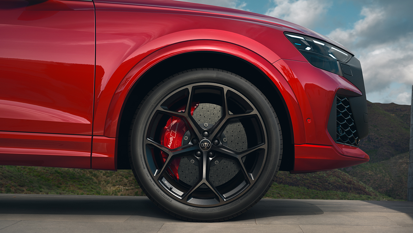 足まわりにはマットブラックで仕上げた5Yスポークデザイン*の23インチアルミホイールを装備。ホイールの先に垣間見えるセラミックブレーキディスクを備えたRSブレーキシステムは、激しい高熱応力の負荷にも対応。制動力とコントロール性だけでなく軽量化にも寄与し、Audi RS Q8 performanceのパワーを意のままに操ることを可能にします。