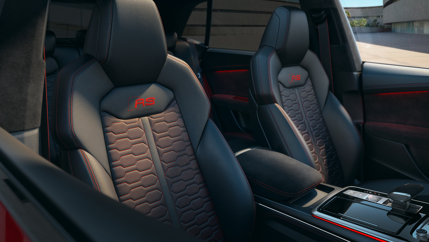 インテリアにおいてもエレガンスとダイナミックな個性を一貫して表現しています。空間の広がりを感じさせる水平基調のダッシュボードに、高解像度モニターに触れるだけで操作可能なMMIタッチレスポンスを一体化し、ラウンジのような心地よさとドライバーオリエンテッドを追求。滑らかな手触りのバルコナレザーで仕立てられたRS専用スポーツシートをはじめ、カーボンツイルマット*のデコラティブパネルなど、細部に至るまで厳選されたマテリアルと妥協を許さないクラフトマンシップが息づき、この一台が特別な存在であることを主張します。