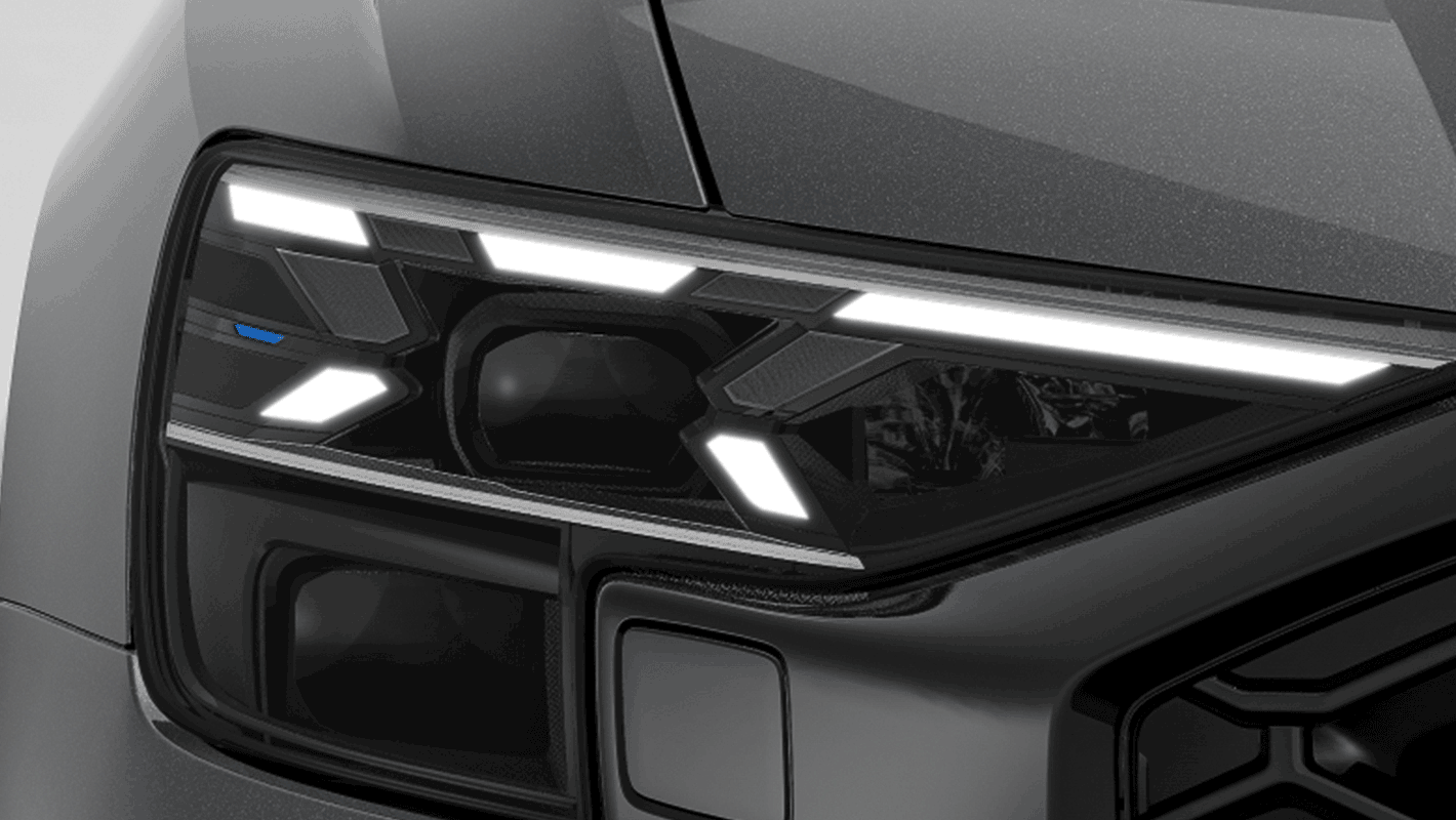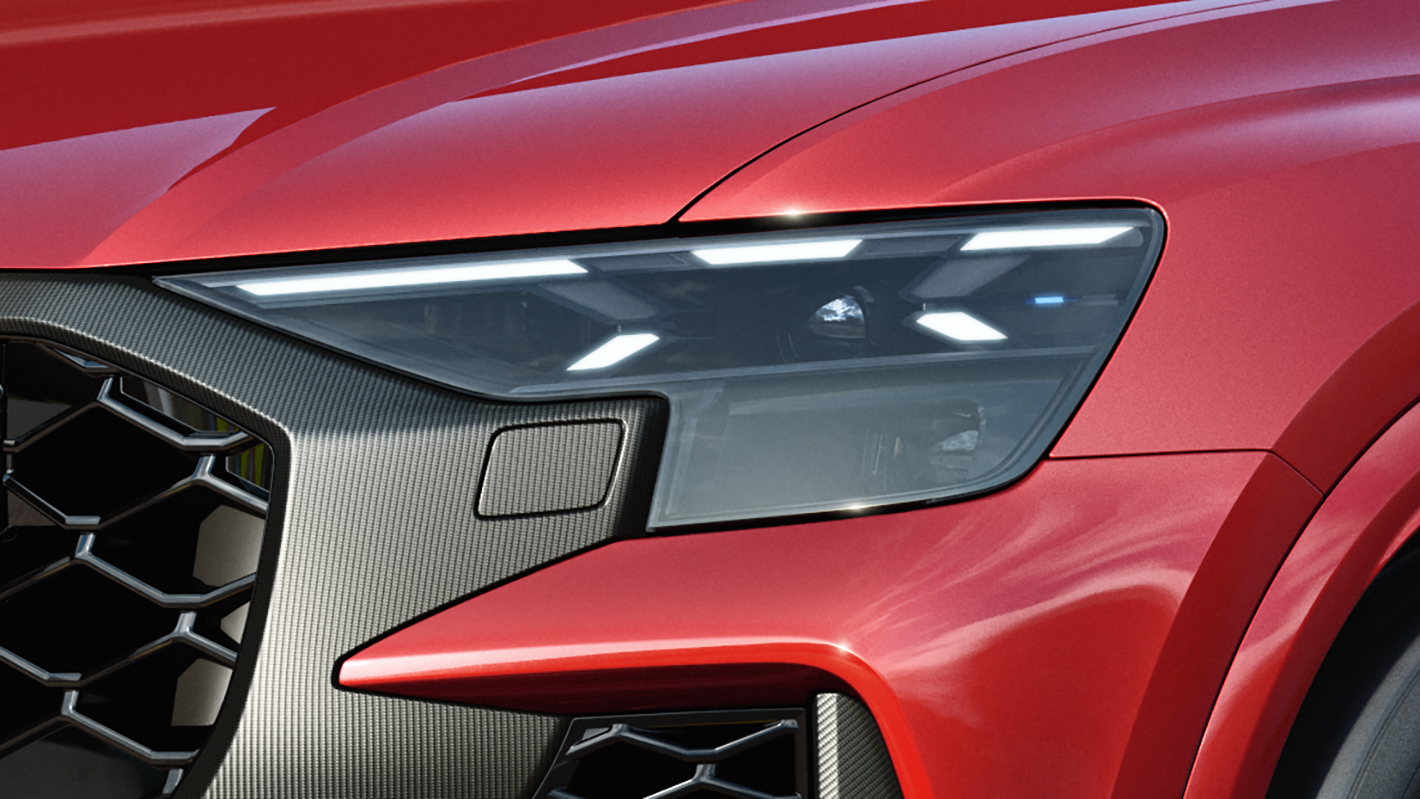 HDマトリクスLEDヘッドライトは、解像度が高い光で道路を高精細に照射。高速走行でハイビーム使用時にカメラが対向車や先行車を検知すると、そのエリアへのハイビームをオフにしつつ、それ以外の車間エリアや周辺は明るく照らし続けます。アウディレーザーライトは高速走行時に作動し、ハイビームの照射距離を約2倍に拡大。MMIタッチディスプレイでAudi RS Q8 performance専用のチェッカーフラッグデザインを含む5つの点灯パターンを切り替えられるデジタルデイタイムランニングライトと、印象的な光の流れを生みだすダイナミックターンインディケーターも搭載しています。