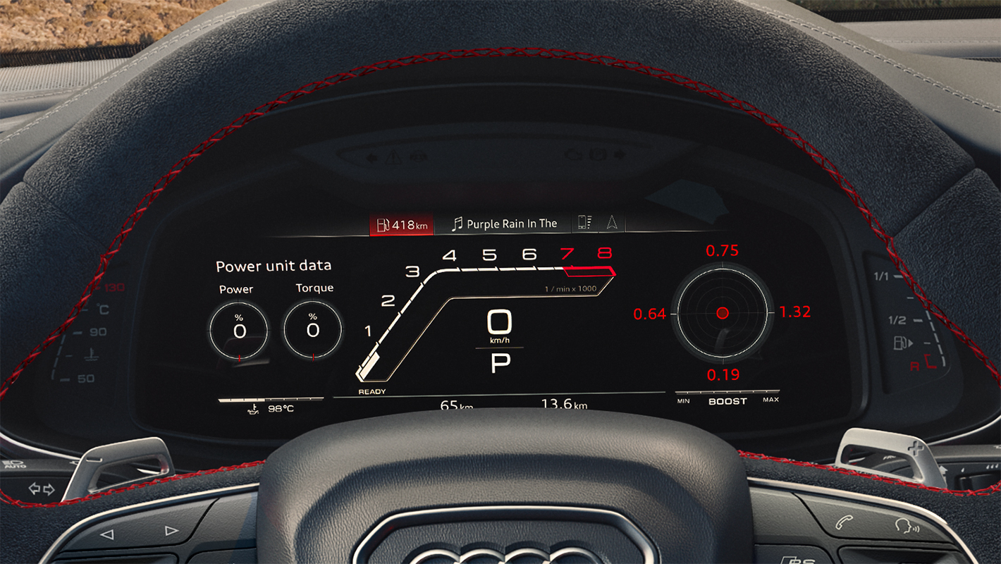高解像度12.3インチカラー液晶フルデジタルディスプレイに、スピードメーター、タコメーター、マップ、ラジオ/メディア情報などをフレキシブルに表示。操作はマルチファンクション付きステアリングホイールからダイレクトに行えます。レイアウトは「スポーツ」、「パフォーマンス」、「ランウェイ」、「レブカウンター」から選択でき、パワー/トルク、Gメーター、ラップタイマーなどをカスタマイズして表示できます。計器ダイヤルはモータースポーツを彷彿とさせる白背景も選べます。またVIEWボタンを押すことでメーターの大小切り替えも可能。メーター表示を小さくすれば、オンボードコンピューターやMMIナビゲーションのコンテンツ、3D地形図などをより見やすく画面の広いエリアに表示できます。