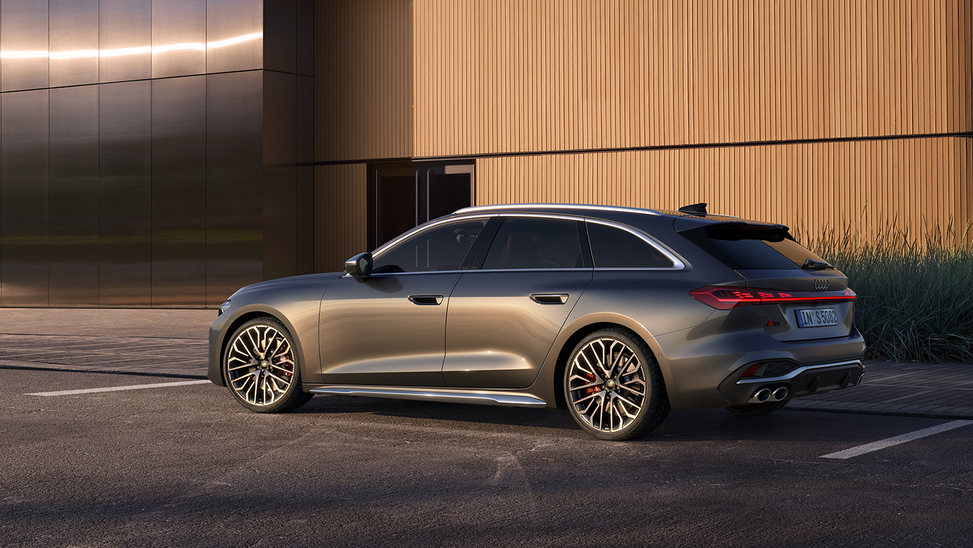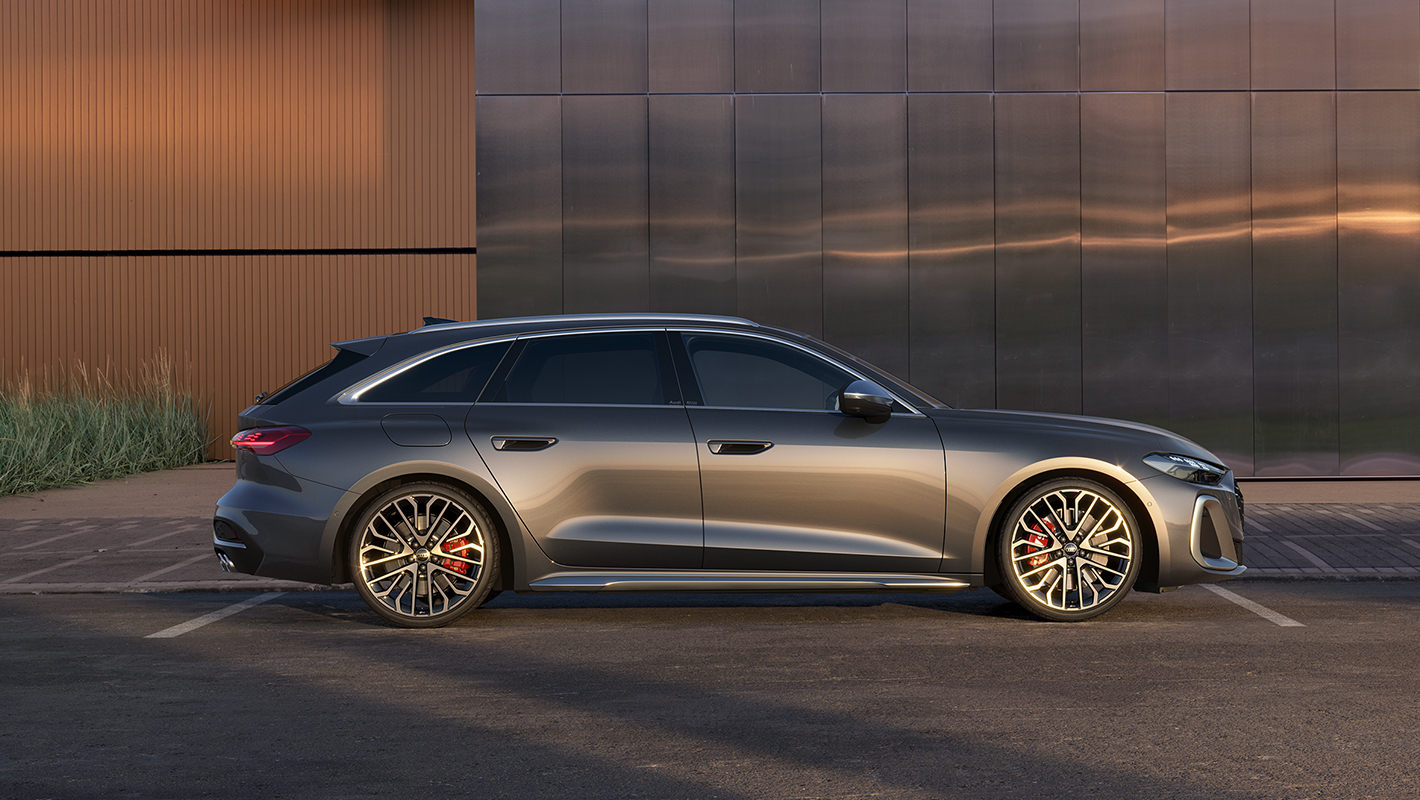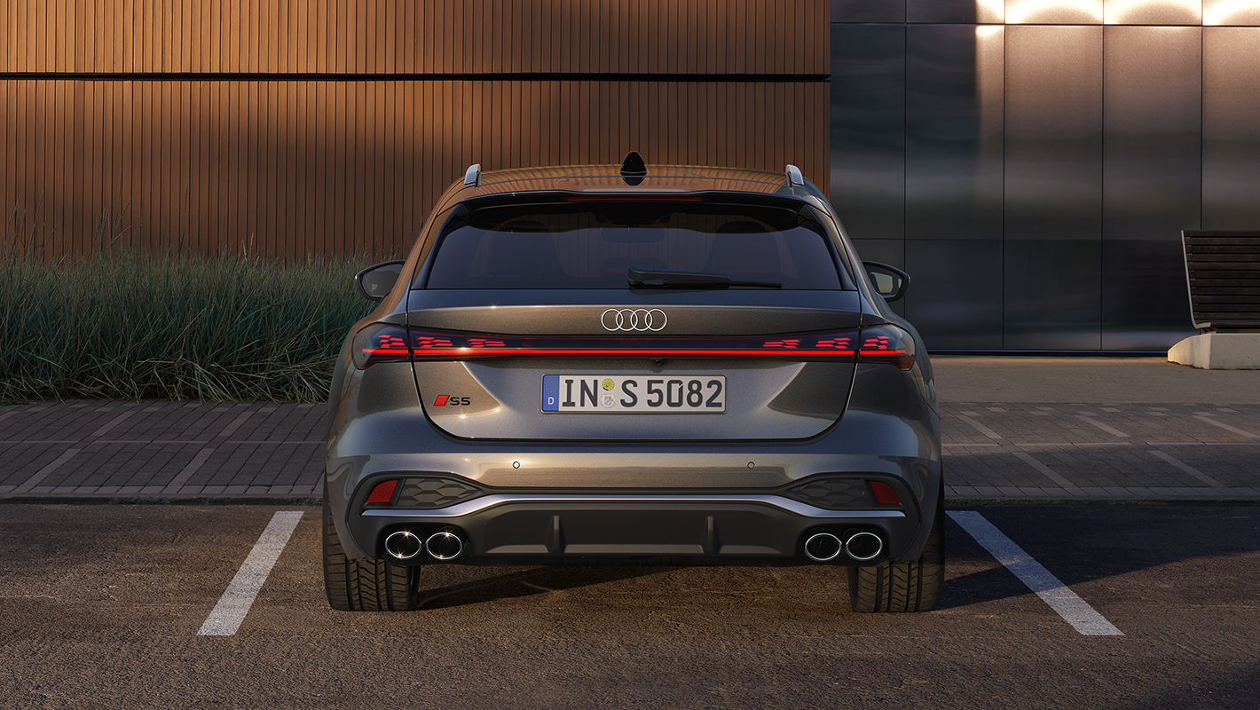 ダイナミックなシルエットと立体的な面による造形が、圧倒的な走りを予感させるサイドビュー。Audi S5 Avantの引き締まったルーフラインはルーフスポイラーへシームレスにつながり、フラットなリヤウィンドウとともに、シャープなフォルムを実現。長いホイールベース、低く構えたボディ、強く張り出した前後のブリスターフェンダーが力強い疾走感に満ちた走りを予感させます。
