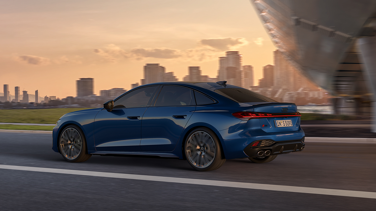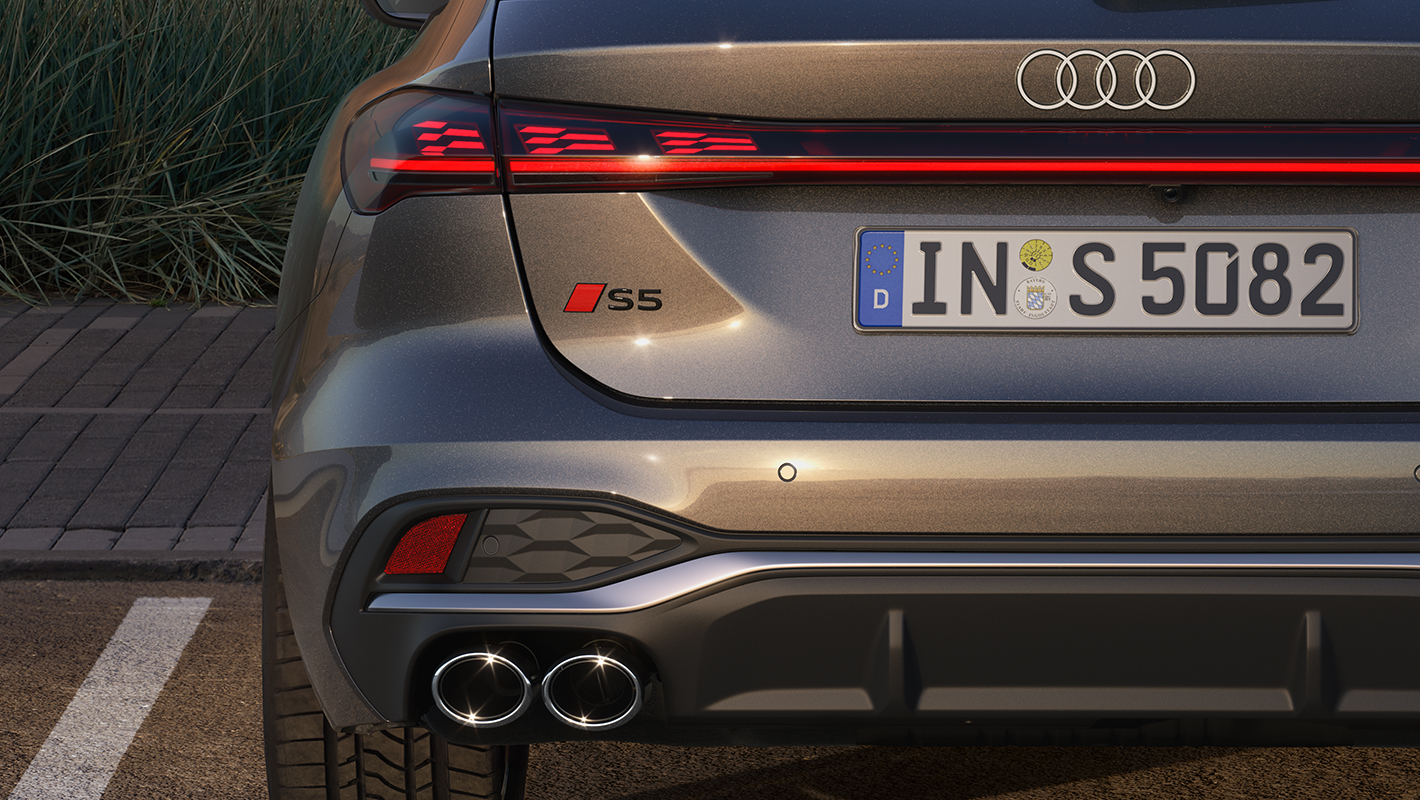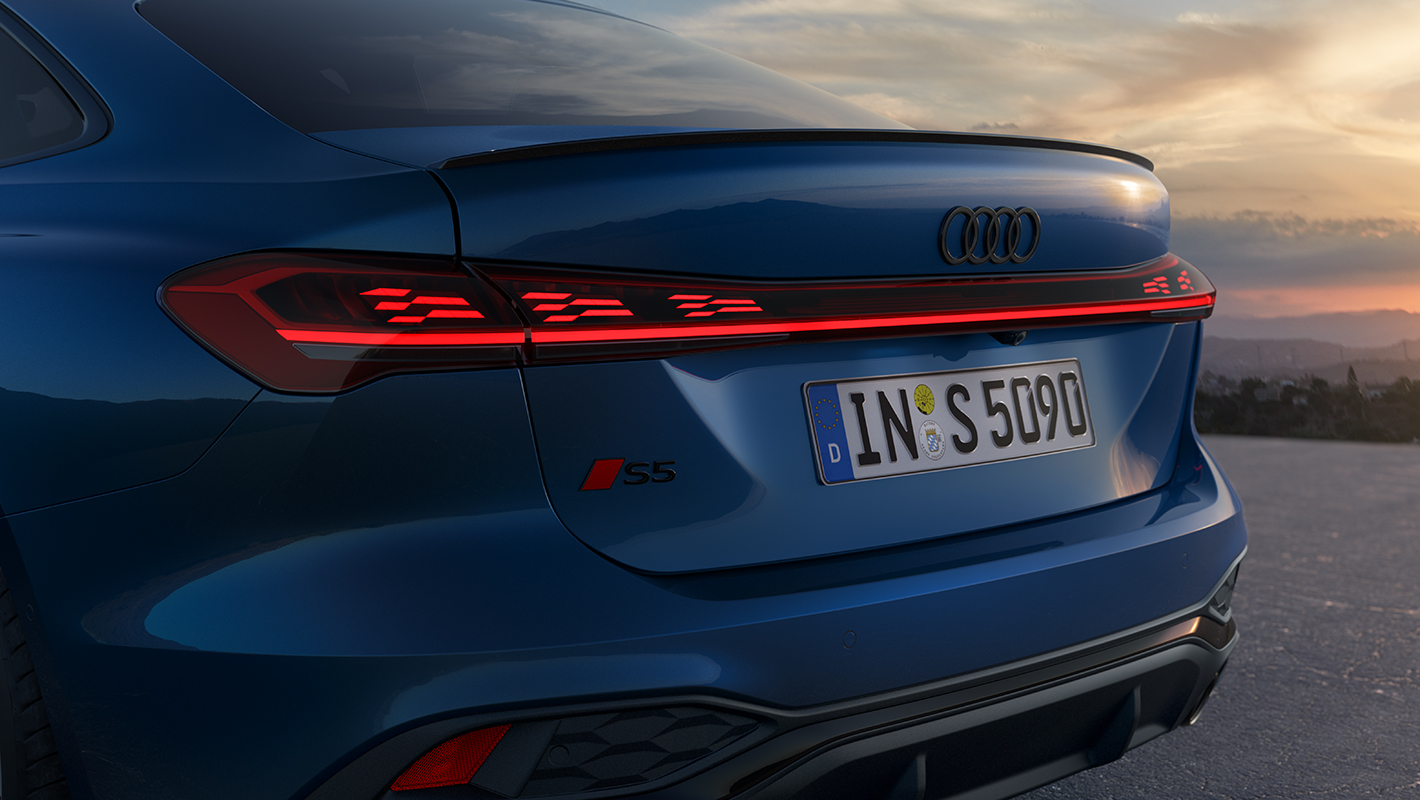 低く構えたロングホイールベースの躍動的なプロポーションにダイナミックなディテールを加え、スポーティなスタイルを際立たせたAudi S5。L字型インサート付きのマットチタンブラックで仕上げたハニカムメッシュのシングルフレームグリルと大型エアインテーク、抑揚に富んだボディに大きく張り出したブリスターフェンダーが内に秘めたパフォーマンスを主張します。デジタルOLEDリヤライトは先進性を物語り、立体的な造形とデジタルテクノロジーが見事に融合。4本出しテールパイプがSモデルの個性を象徴します。
