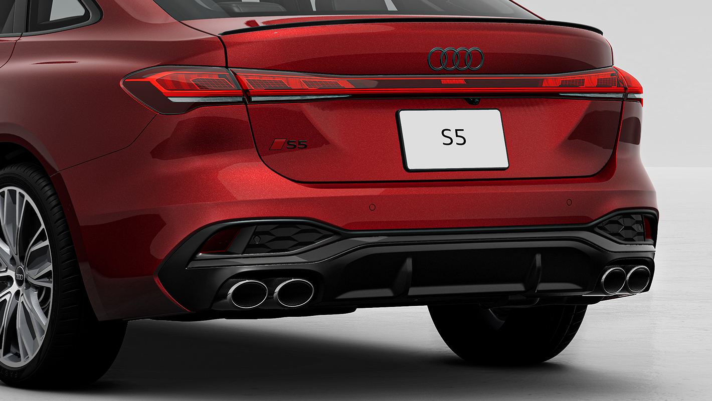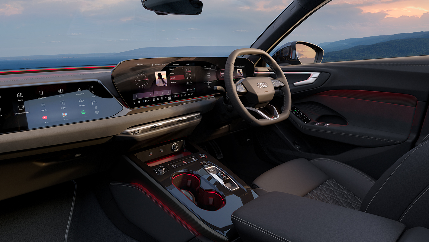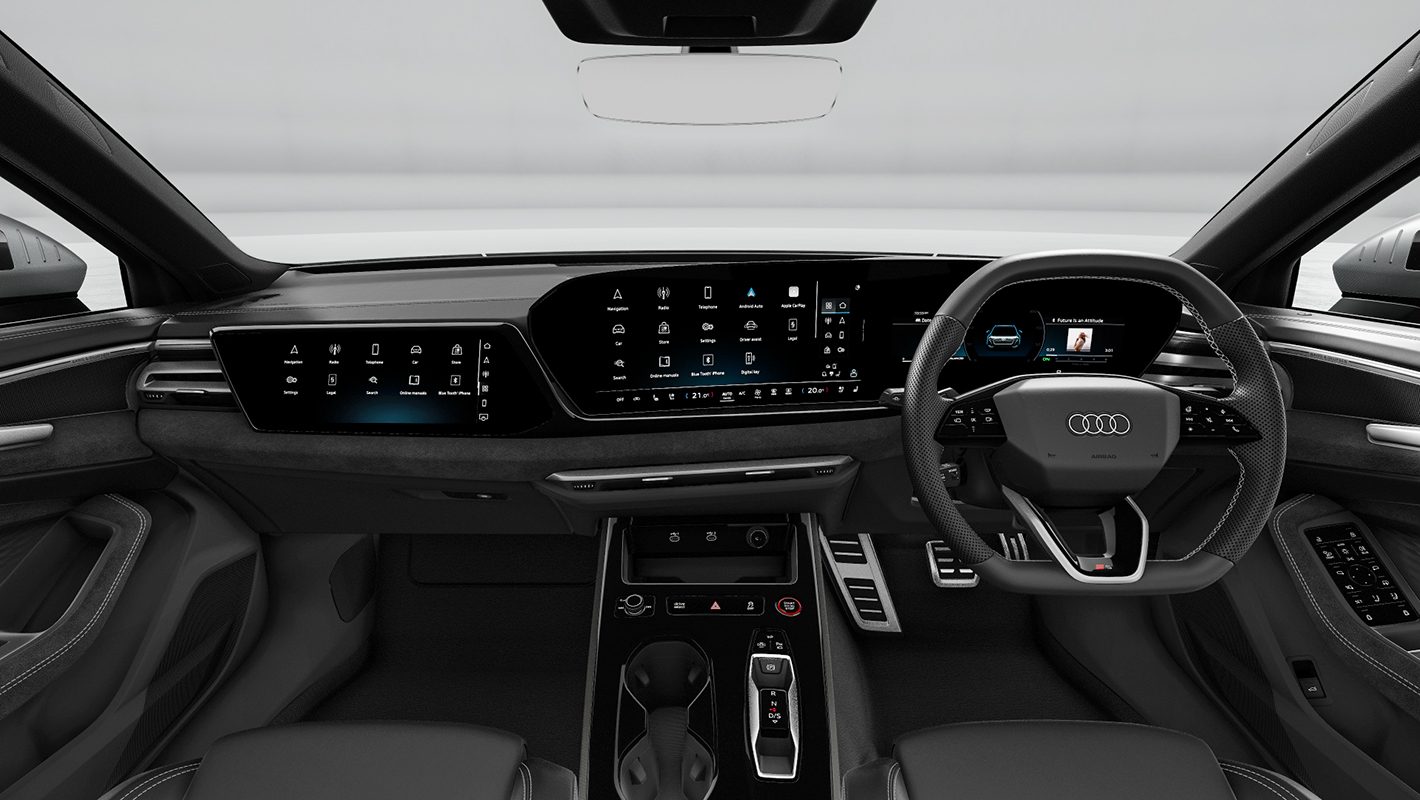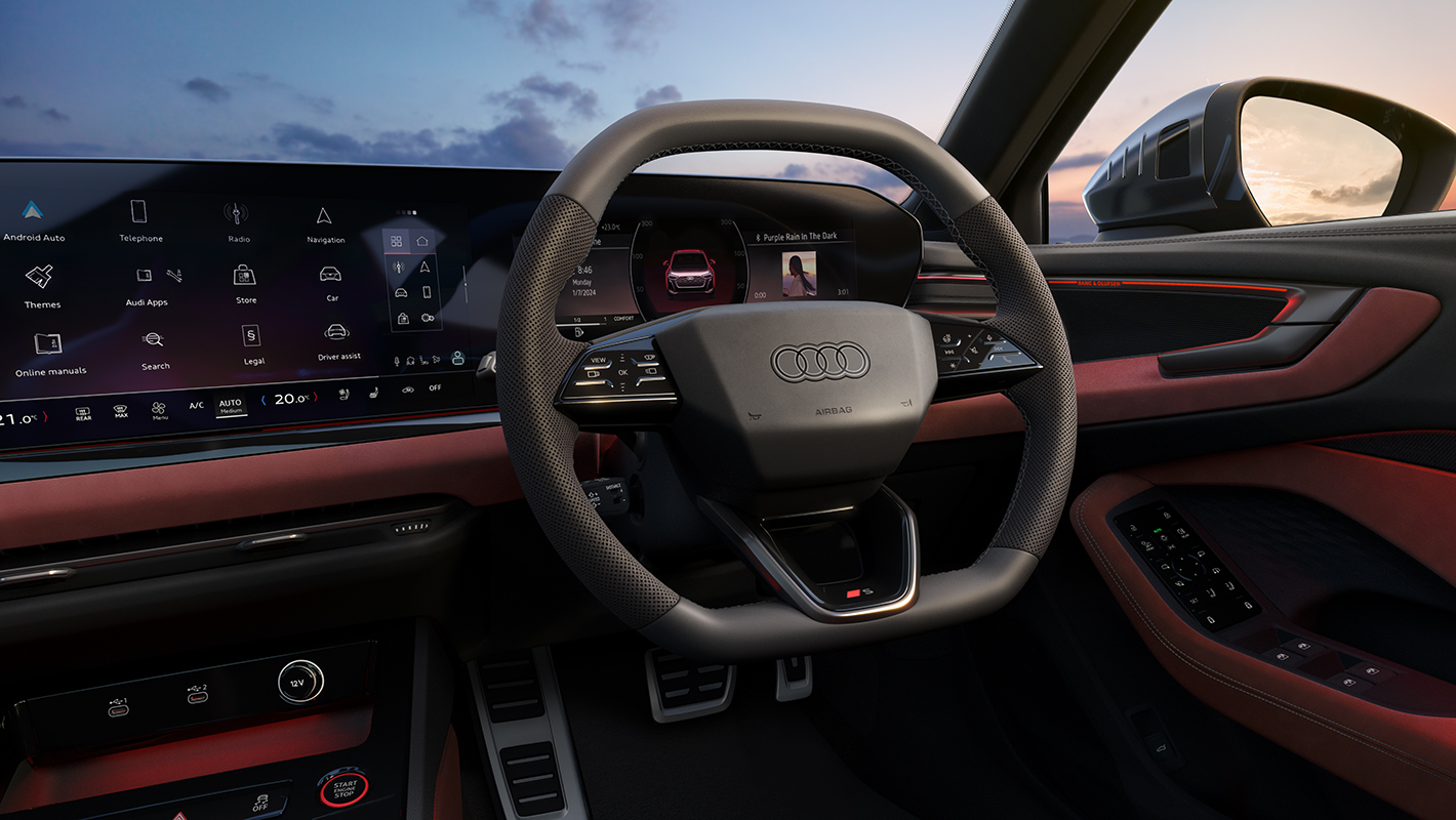ステアリングホイールのAudi ringsやスポーク、ドアレバー、エアベントトリム、シフトスイッチトリムなどのメタリックパーツがダークな色調になり、引き締まったインテリアを演出します。