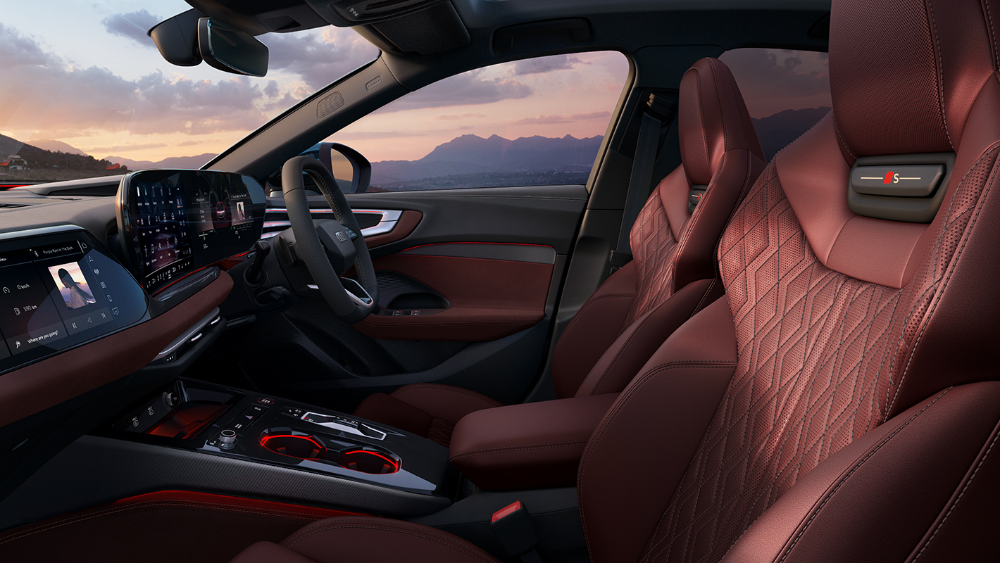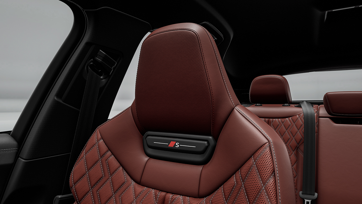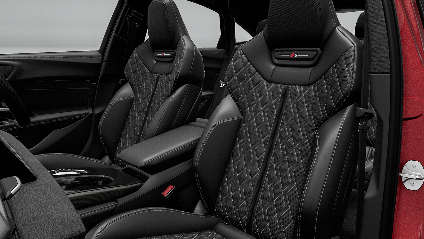一体型ヘッドレストを備えたホールド性の高いスポーツシート。シートサイドボルスターはコーナリングの際、身体をしっかりサポートする形状に。パーフォレイテッド加工が施され、シートベンチレーション機能を搭載。マッサージ機能も備えています。バックレストのSロゴ、上質で温かみのあるファインナッパレザー、コントラストのある印象的なダイヤモンドステッチが、スポーティでエレガントな雰囲気を際立たせます。