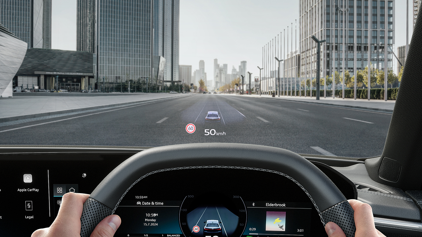 車速、アシスタンスシステムに関する情報、ナビゲーションの指示、警告、音楽などのコンテンツの操作画面を、ドライバーの直接視界に入るフロントウィンドウ上に必要に応じて投影します。高さ調整が可能で、ドライバーの視線の中に読みやすいコントラストのマルチカラーで情報を表示します。