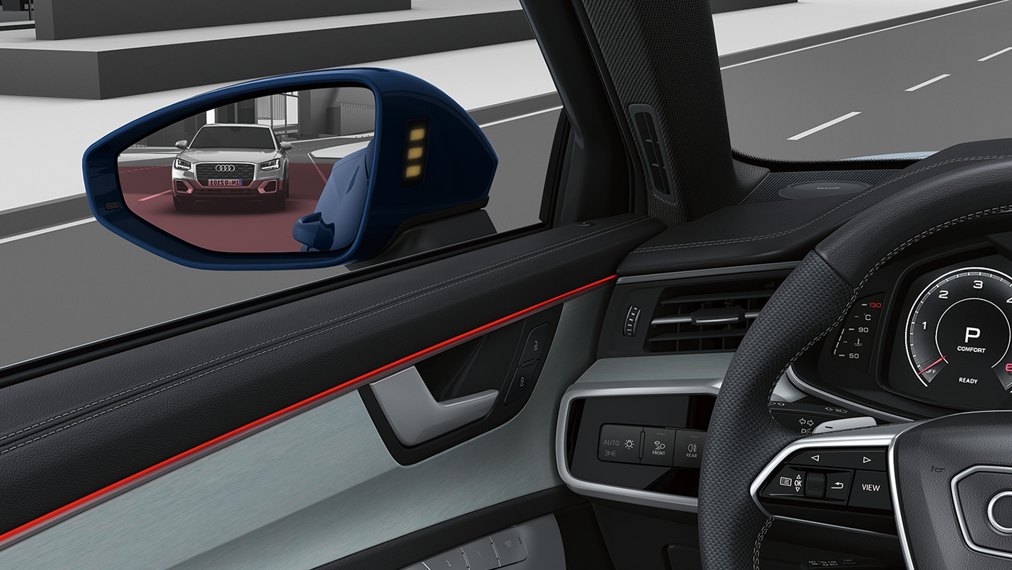 システムがレーダーセンサーを用いて後方に迫る車両を監視。クルマの停車時にドアを開ける時、後方から近づく車両と衝突する危険がある場合、乗員に注意喚起を行います。ドアのハンドルをひくと、ドアのストリップライトとエクステリアミラーのLED表示が点灯し警告します。