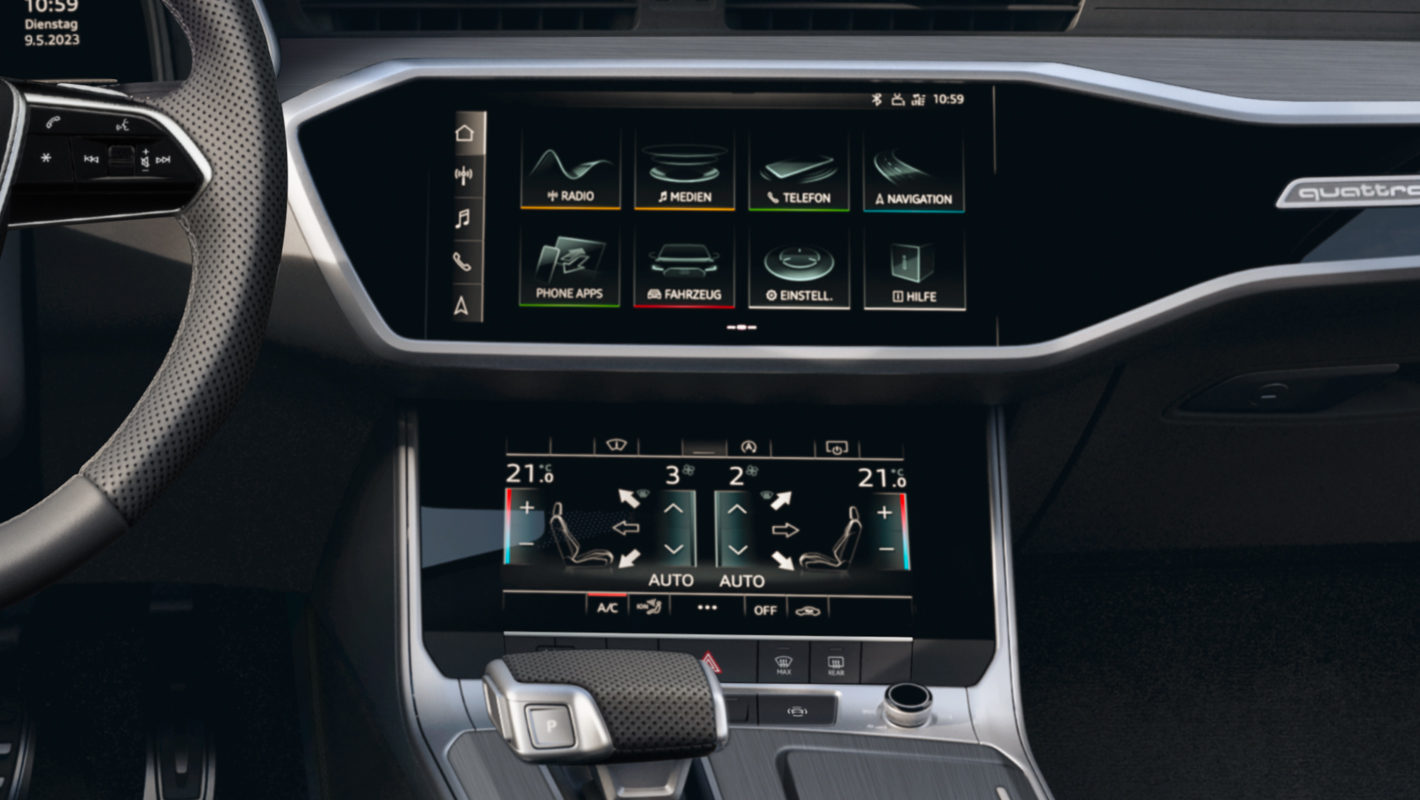 デジタル時代にふさわしいユーザーインターフェースであるMMIタッチレスポンスは、フラットな高解像度モニターで車両のセッティングやインフォテインメントを直感的に操作することが可能。グラフィックや振動、音によって、視覚、触覚、聴覚に明確な反応を感じ取れます。インフォテインメント用の10.1インチアッパースクリーンと、空調操作や手書き文字入力用の8.6インチローワースクリーンの2つのタッチディスプレイを搭載。イグニッションをOFFにするとスクリーンが漆黒のフラットなブラックパネルとなり、周囲のインテリアに溶け込みます。