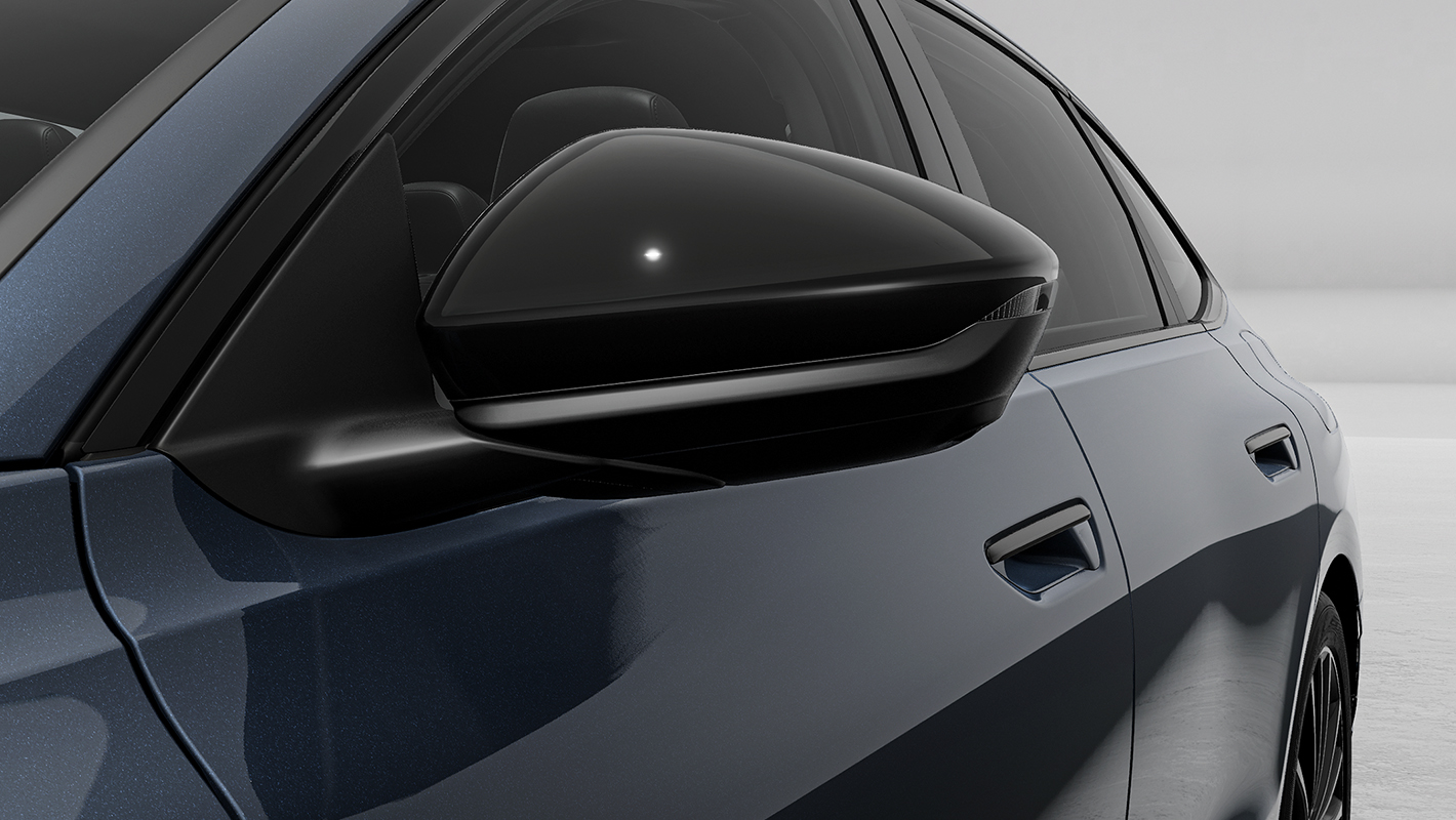 従来のエクステリアミラーの代わりに小型カメラシステムを搭載。後方の様子は車内のOLEDタッチディスプレイに映し出されます。従来のミラーに比べて空気抵抗と風切り音を低減するとともに、雨や雪などの悪天候時や夕暮れ時にも周囲を鮮明な映像で確認できます。視界の位置や角度は近接センサー付きタッチディスプレイに触れることで調整可能。駐車時、右左折時、高速走行時など、様々なシーンで高い視認性を提供します。