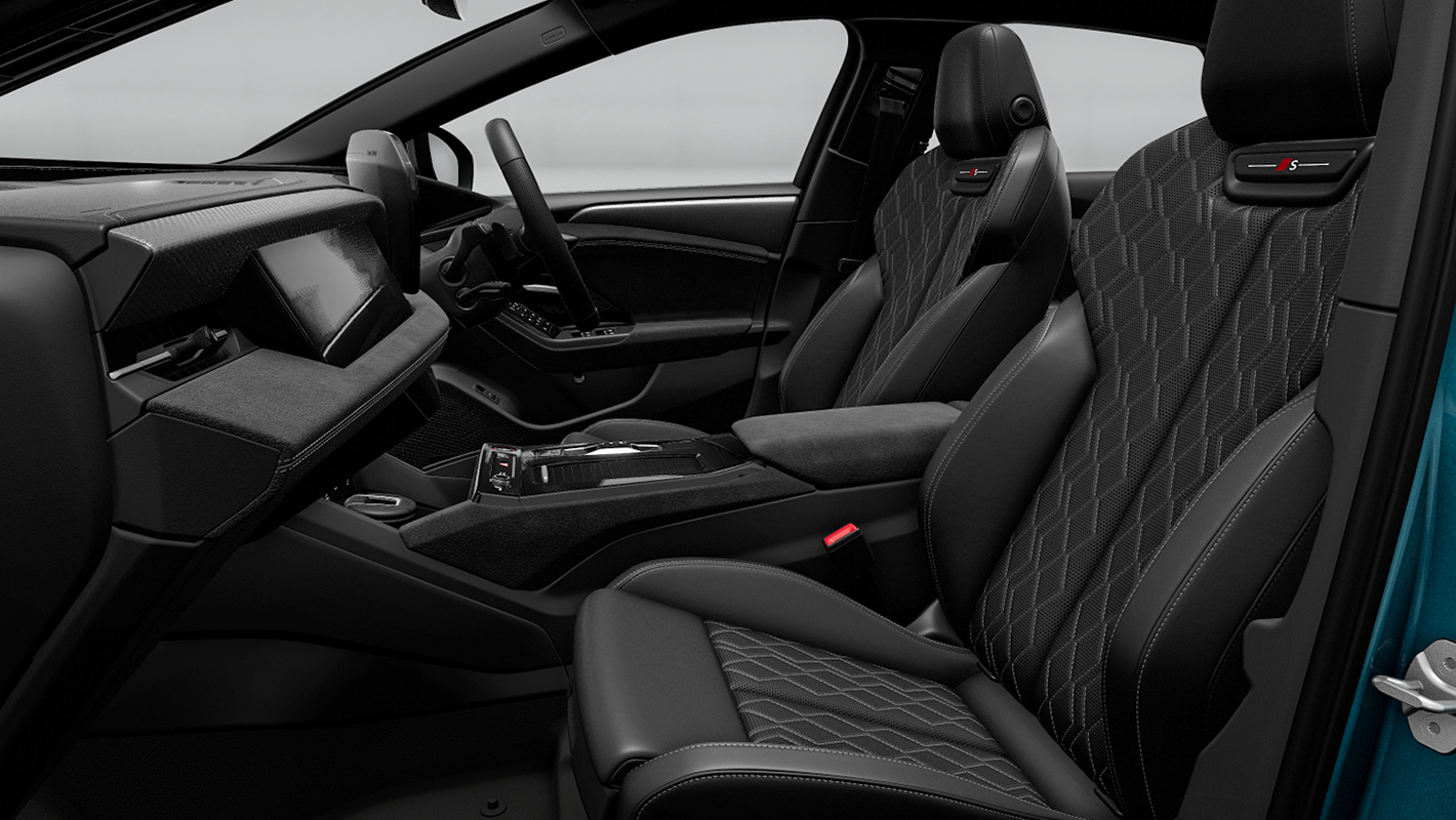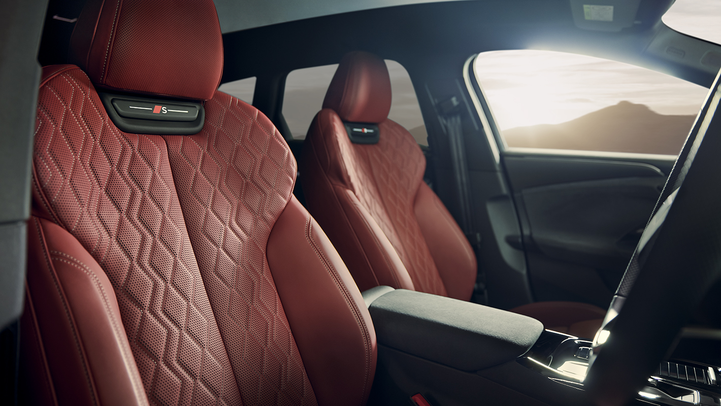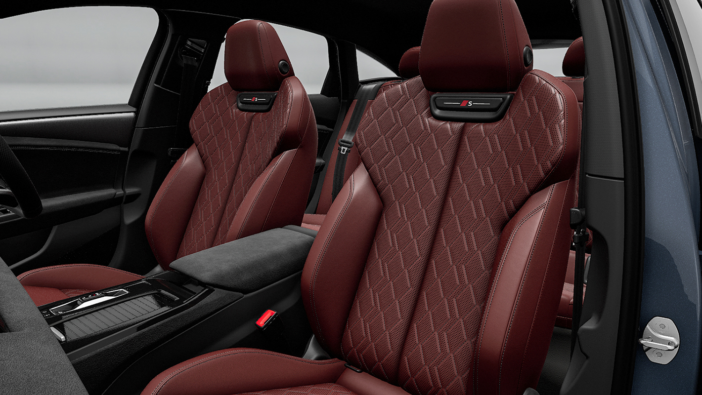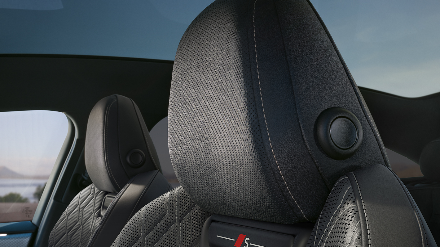 一体型ヘッドレストを備えたホールド性の高いスポーツシート。シートサイドボルスターはコーナリングの際、身体をしっかりサポートする形状に。パーフォレイテッド加工が施され、シートベンチレーション機能を搭載。マッサージ機能も備えています。バックレストのSロゴ、上質で温かみのあるファインナッパレザー、コントラストのある印象的なダイヤモンドステッチが、スポーティでエレガントな雰囲気を際立たせます。