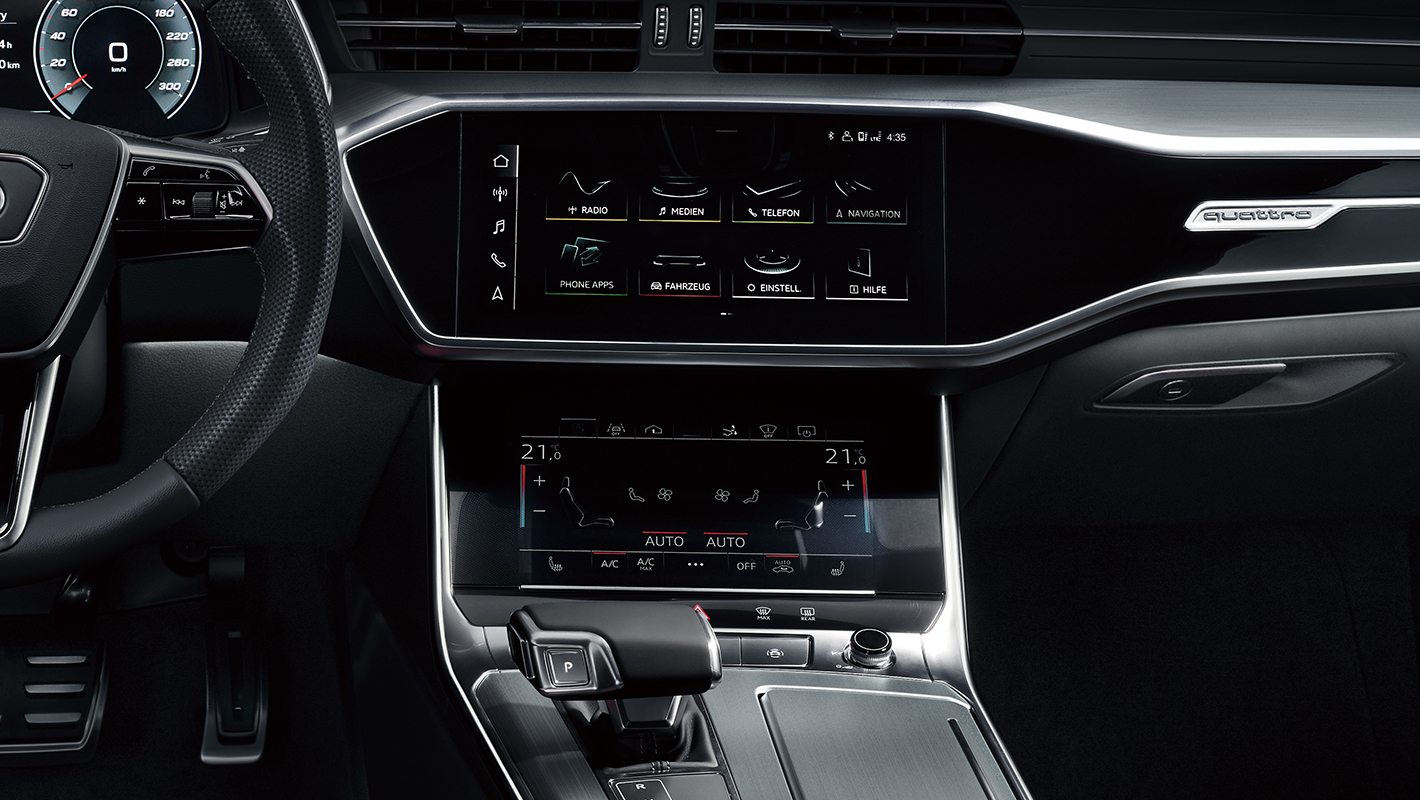 デジタル時代にふさわしいユーザーインターフェースであるMMIタッチレスポンスは、フラットな高解像度モニターで車両のセッティングやインフォテインメントを直感的に操作することが可能。グラフィックや振動、音によって、視覚、触覚、聴覚に明確な反応を感じ取れます。インフォテインメント用の10.1インチアッパースクリーンと、空調操作や手書き文字入力用の8.6インチローワースクリーンの2つのタッチディスプレイを搭載。イグニッションをOFFにするとスクリーンが漆黒のフラットなブラックパネルとなり、周囲のインテリアに溶け込みます。