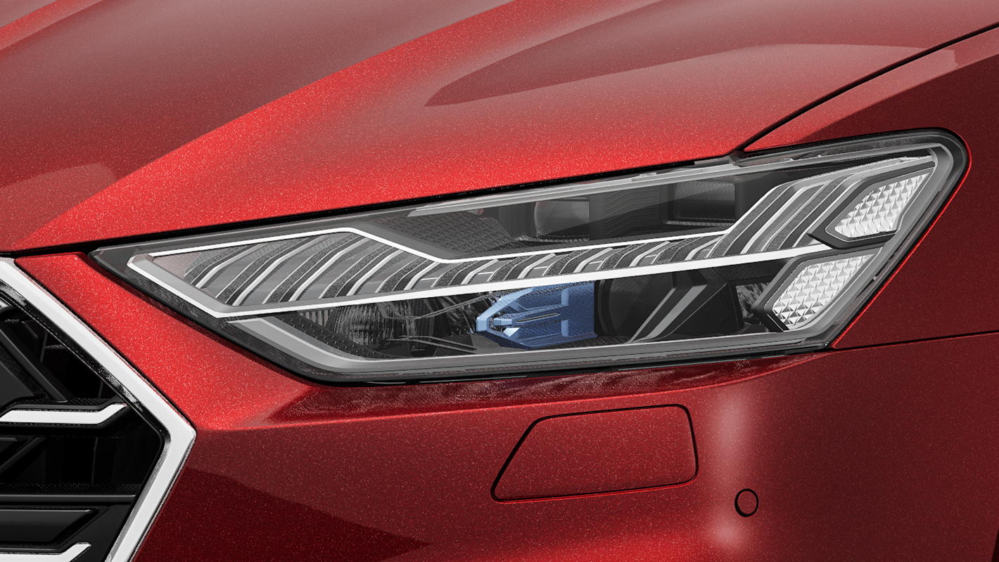 先進のライティングテクノロジーを印象的に視覚化。HDマトリクスLEDヘッドライトは、状況に合わせて配光を可変させ高度に制御。高速走行で対向車や先行車の車両を検知すると、検知された車両へ直接光を照射しないようにコントロールしつつ、それ以外の車間エリアや周辺は明るく照らし続けます。アウディレーザーライトはハイビームの照射距離を約2倍に拡大。シャープな眼差しがフロントフェイスに精悍さを与えます。