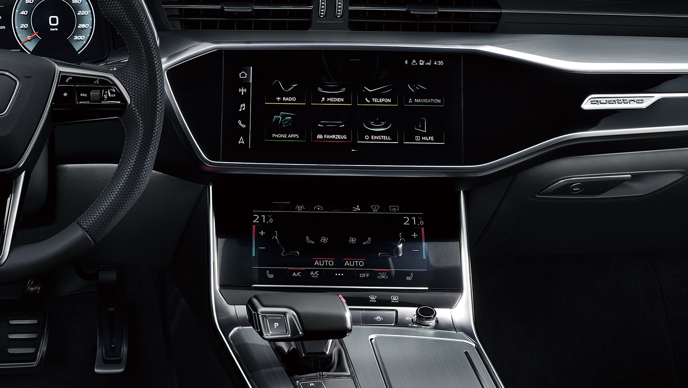 デジタル時代にふさわしいユーザーインターフェースであるMMIタッチレスポンスは、フラットな高解像度モニターで車両のセッティングやインフォテインメントを直感的に操作することが可能。グラフィックや振動、音によって、視覚、触覚、聴覚に明確な反応を感じ取れます。インフォテインメント用の10.1インチアッパースクリーンと、空調操作や手書き文字入力用の8.6インチローワースクリーンの2つのタッチディスプレイを搭載。イグニッションをOFFにするとスクリーンが漆黒のフラットなブラックパネルとなり、周囲のインテリアに溶け込みます。