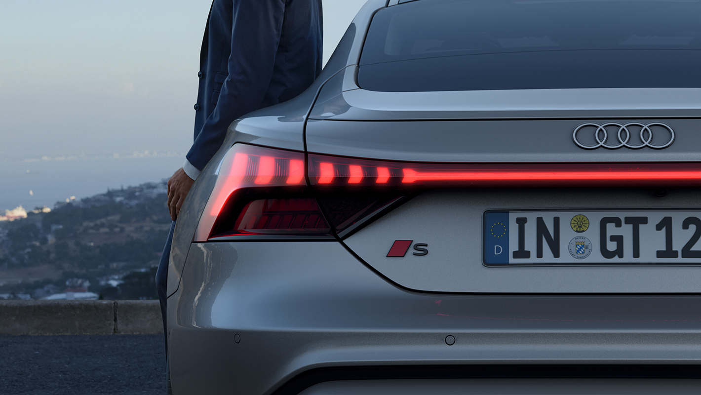 リヤエンドの幅全体に広がるリヤライトがAudi S e-tron GTのワイドなスタンスを強調。外側に向かって大きくなるアロー型の特徴的な点灯パターンが美しいリヤのスタイリングを際立たせ、先進性を印象づけます。