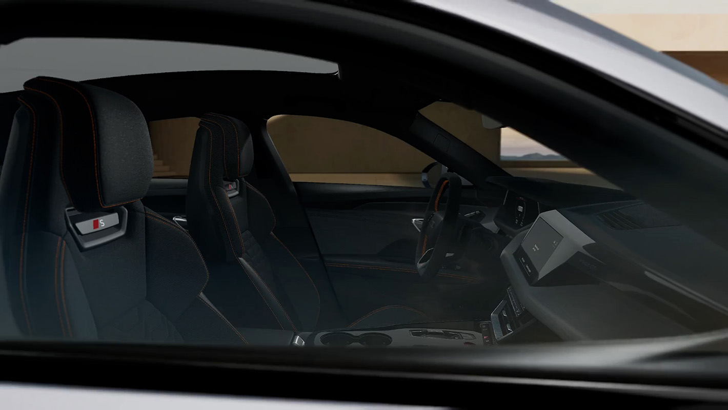 Audi S e-tron GTは一体型ヘッドレストを備えたホールド性の高いスポーツシートプラスを標準装備。シートサイドボルスターがコーナリング時のホールド性を高め、長距離ドライブでも快適なポジションを維持します。シート素材には、リサイクル原料から作られたダイナミカとアーティフィシャルレザーを組み合わせ、上質感とサステイナビリティを両立。さらにオプションのレザーフリーパッケージ*を選択すると、インテリア各部がサステイナブル素材の仕上げに。シートには印象的なオレンジのコントラストステッチが施され、唯一無二のスポーティな魅力を引き立てます。