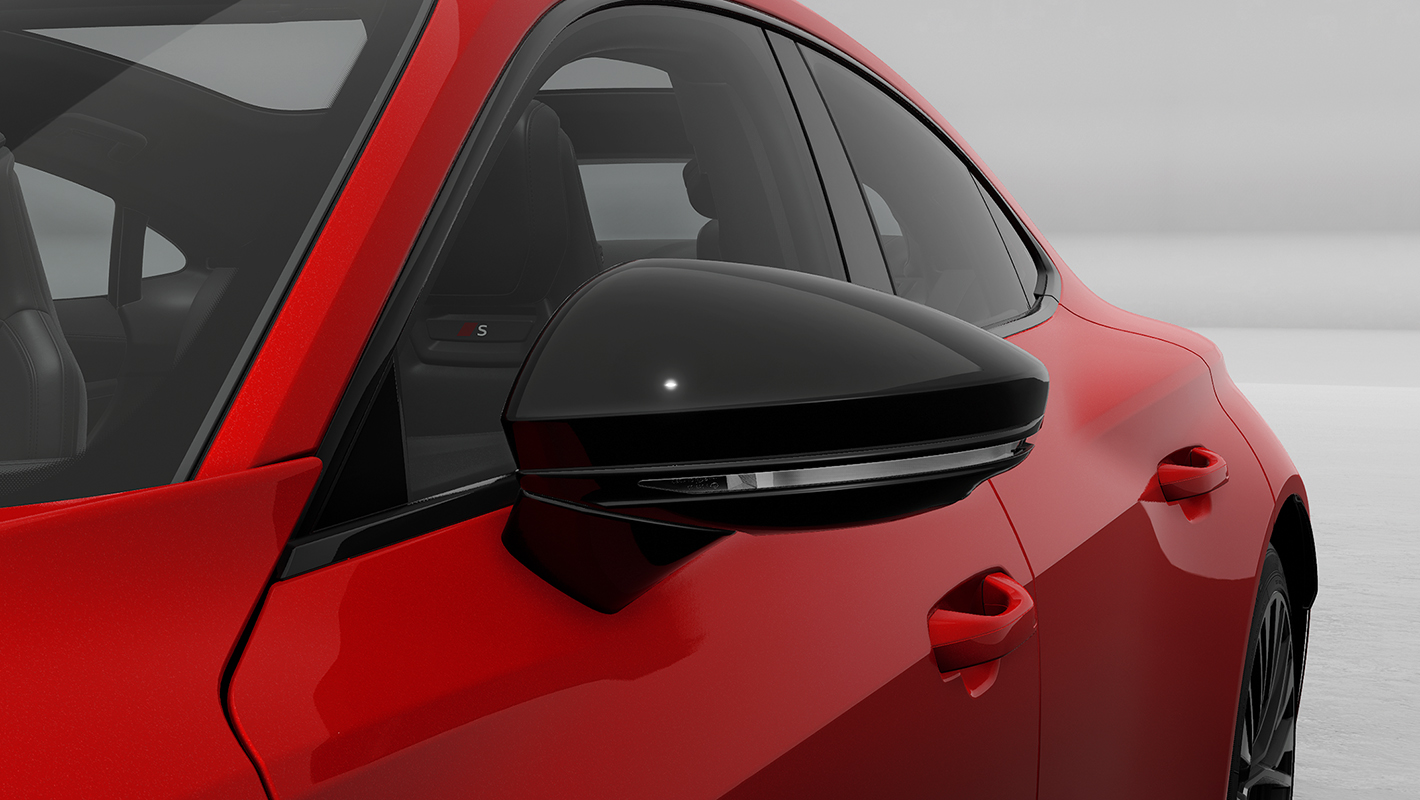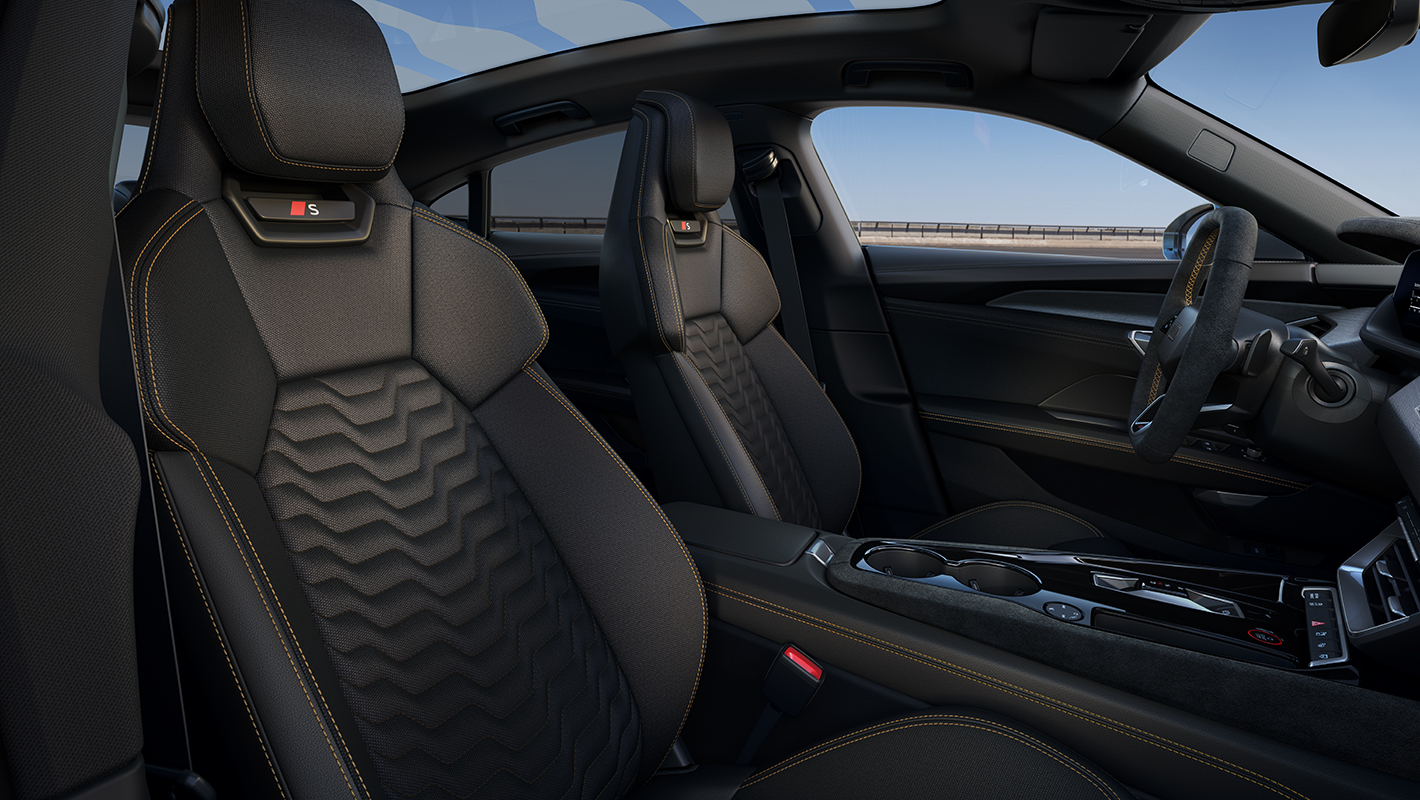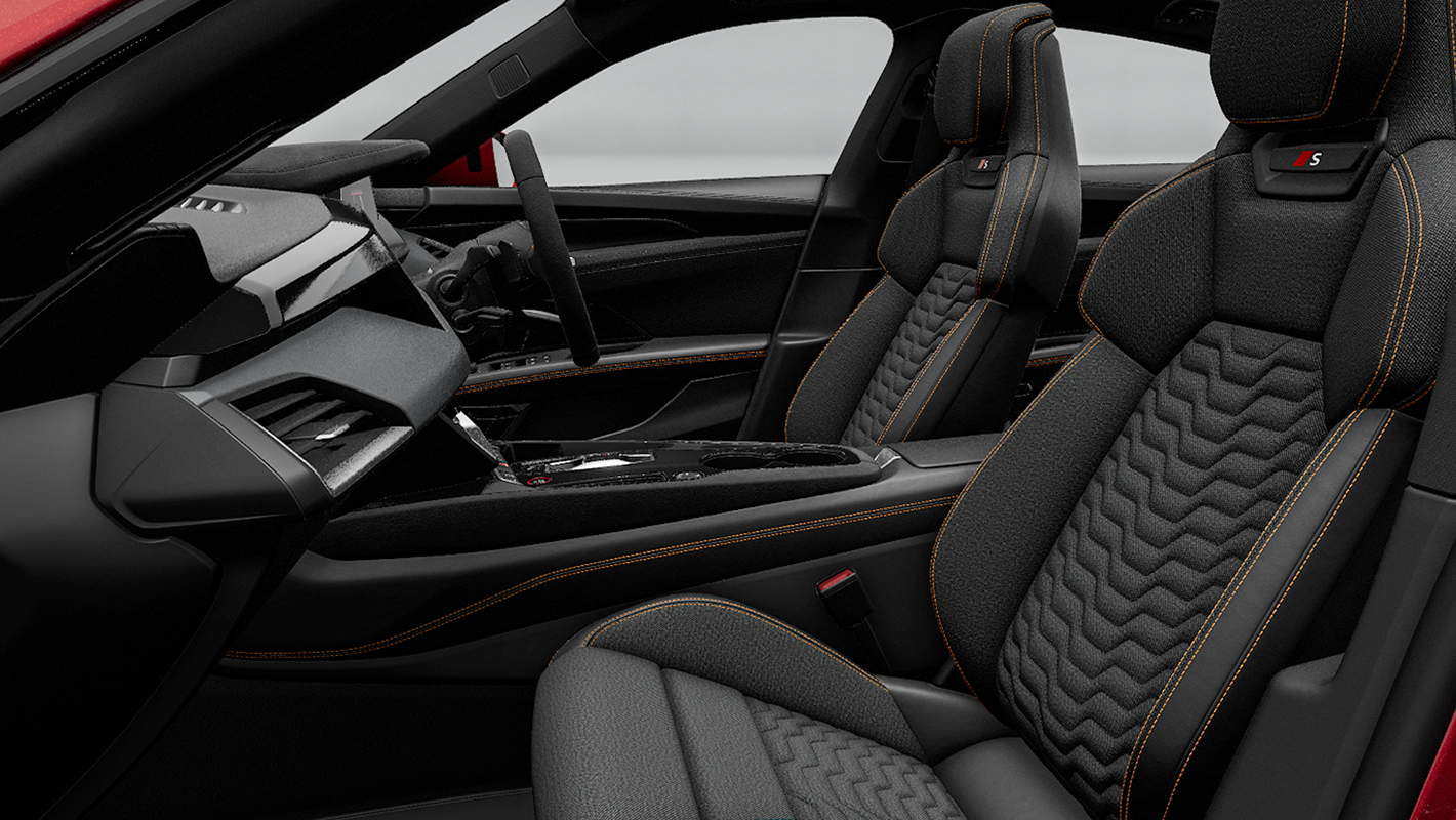 一体型ヘッドレストを備えたホールド性の高いスポーツシートにサステイナブルな素材を採用。リサイクル繊維を含むカスケ―ドクロスとアーティフィシャルレザーを組み合わせています。背もたれに立体的に表現されたウォーターフォールパターン、ダイナミックオレンジのステッチがアクセントとなり、素材の革新性を印象づけます。