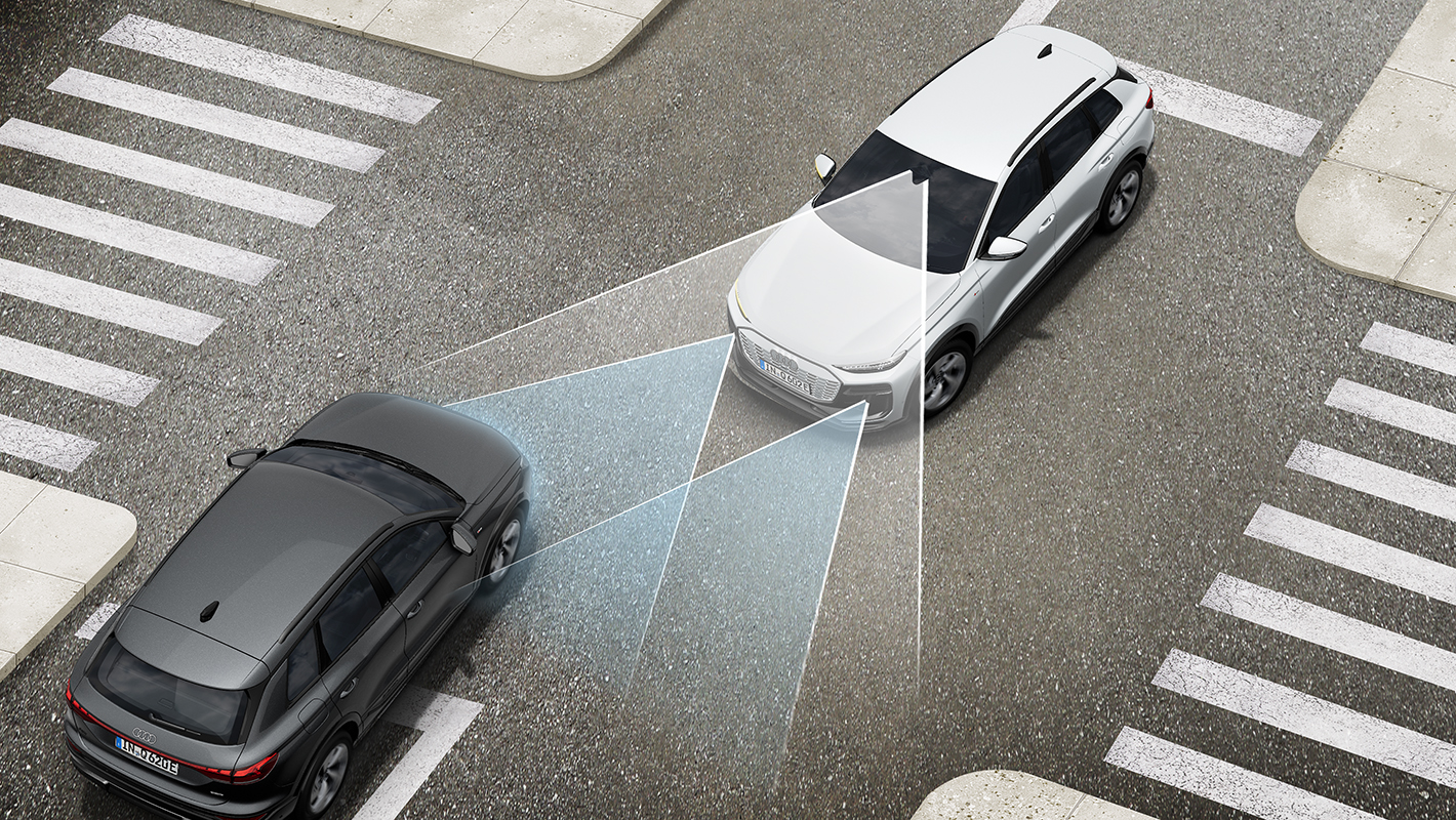 駐車スペースなどからバックして路上に出る際に、左右から接近する車両を監視。衝突の危険を乗員に警告します。ドライバーへの警告はMMIタッチディスプレイへの表示と音声で行われます。危険な状況にあるとシステムが判断すると、ブレーキが作動します。