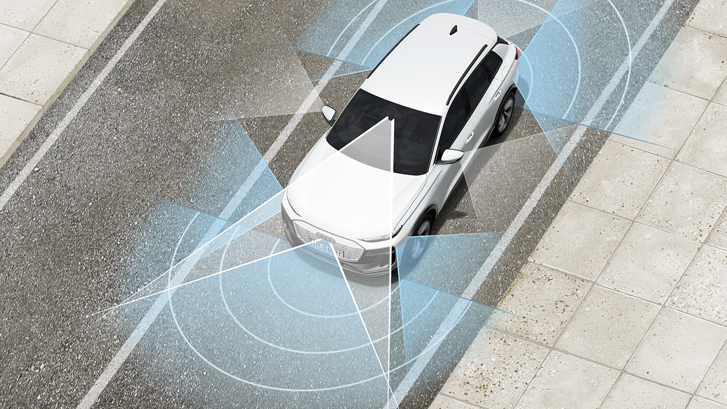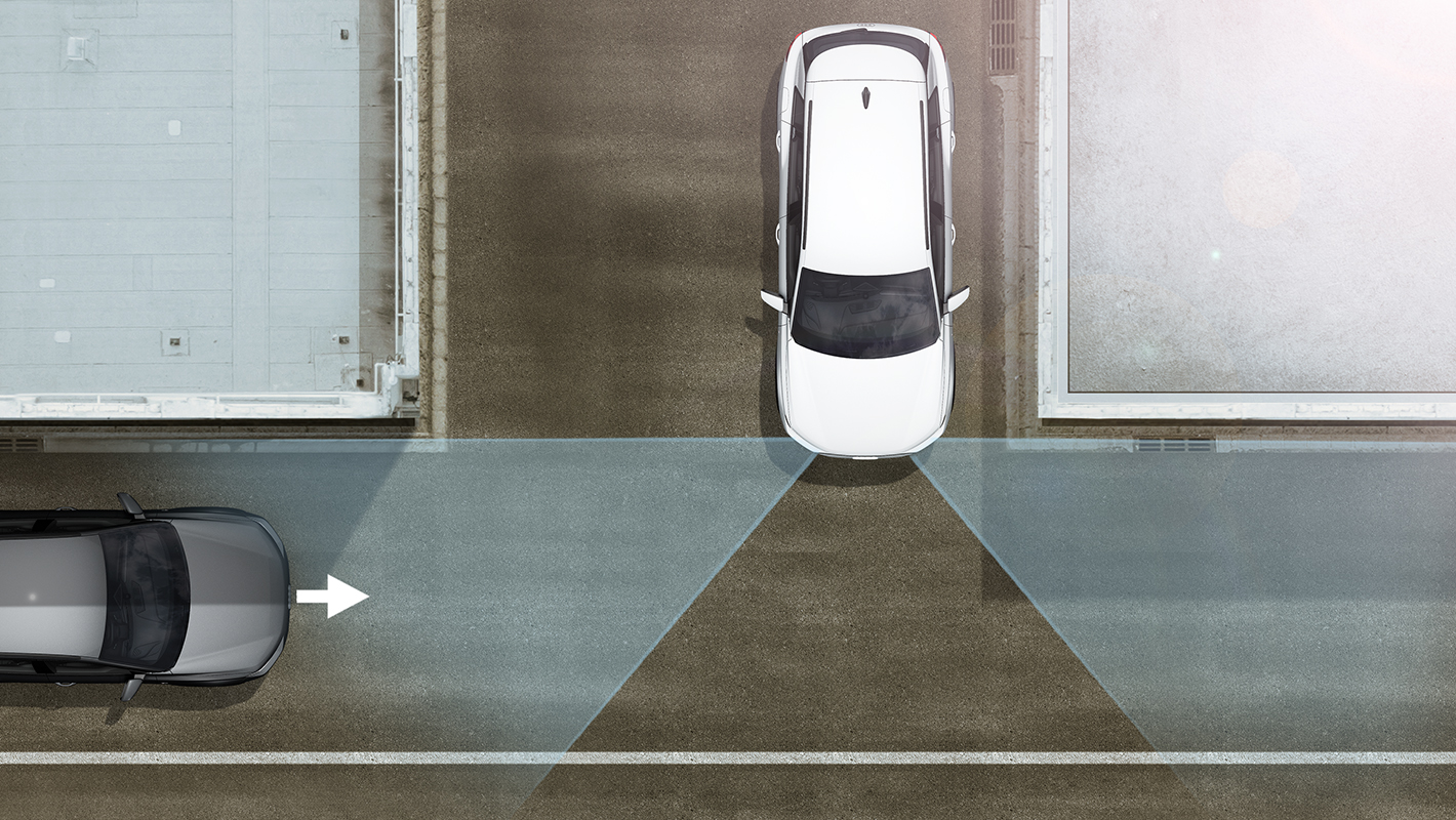 交差点に差し掛かった際、ドライバーから見えないエリアをレーダーセンサーを使って監視。左右から接近する車両について衝突の危険性を警告します。光と音で警告がなされ、ドライバーが反応しない場合はブレーキが介入。状況によって段階的に警告します。車速約65km/h以下で作動し、ブレーキによる振動は約10km/h以下で実行されます。