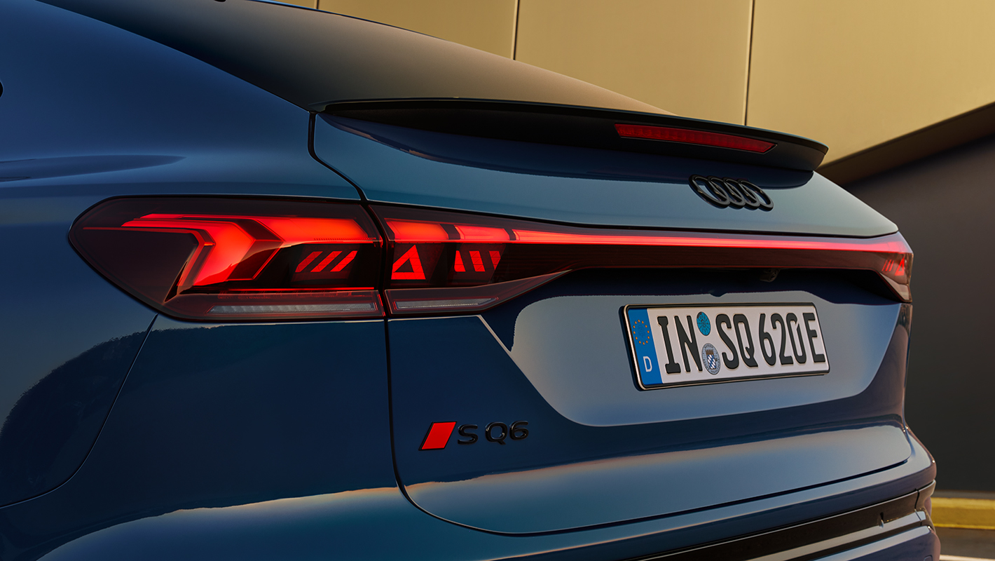 Sモデルのダイナミズムにインテリジェントなテクノロジーが融合したAudi SQ6 e-tronのリヤデザイン。彫刻的な抑揚を持つリヤバンパーは力強さと同時に洗練された印象を与えます。立体的な形状のリヤライトハウジングはスポーティネスを主張する幅広いスタンスのボディに一体化。8つの点灯パターンを備えたデジタルOLEDリヤライト*が、多彩な光の表情をもたらし、力強い存在感を放ちます。