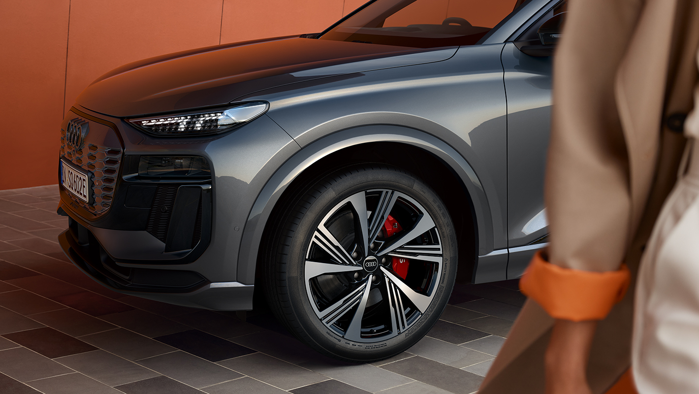 Audi SQ6 e-tronの足元を彩るのは、5アームストラクチャーグラファイトグレーの20インチホイール。ペイントとポリッシュト仕上げが施されたシャープなデザインが陰影を生み出しスポーティネスを演出。さらにオプションでデザインが選べる21インチホイールもご用意。力強い走りを予感させ、Audi SQ6 e-tronのダイナミックなフォルムを際立たせます。