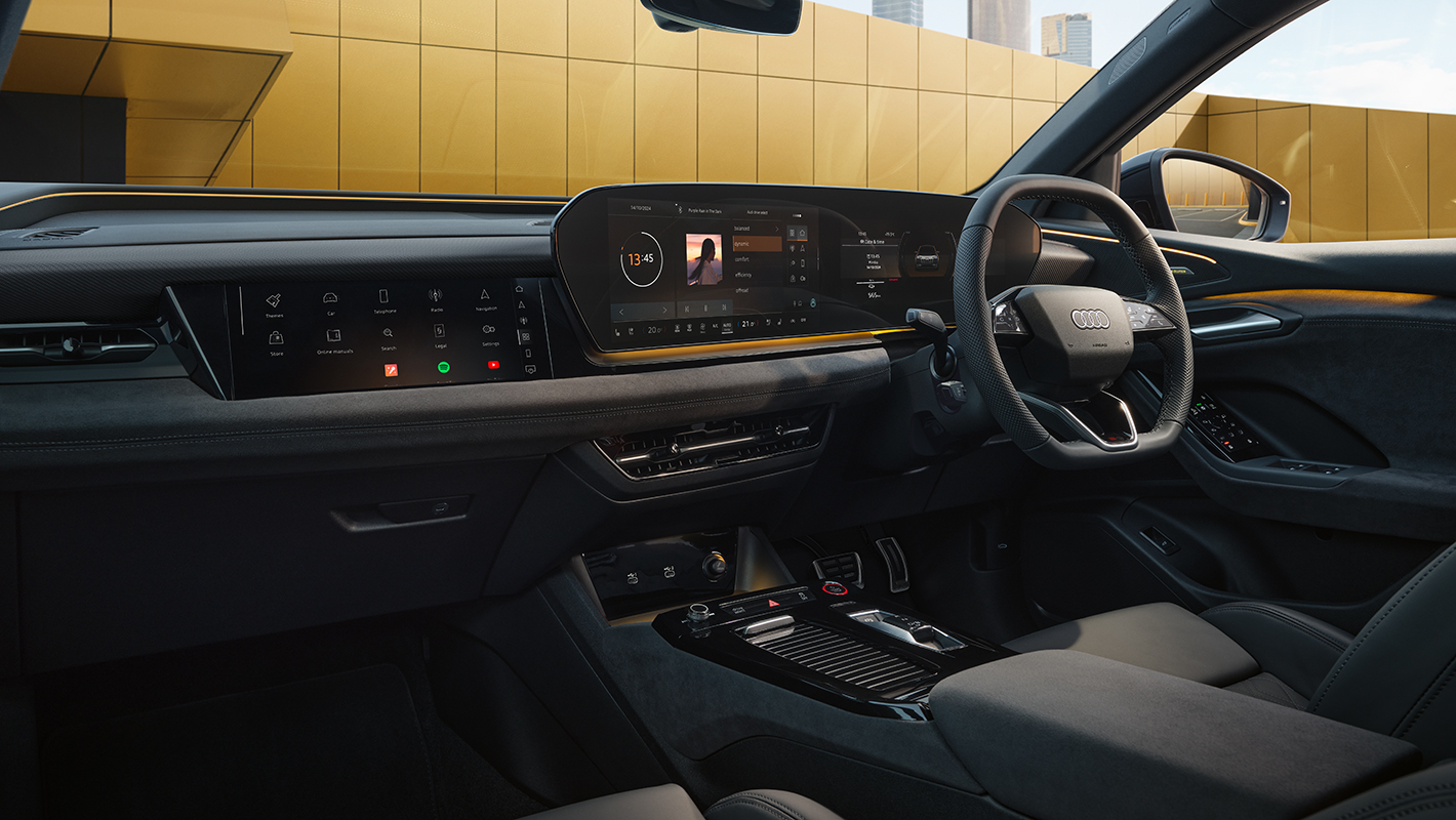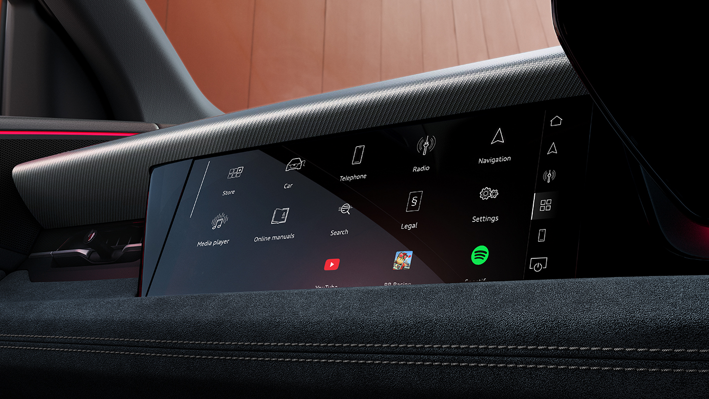 洗練されたデジタルインテリア体験をもたらすMMIパノラマディスプレイ。OLED技術を採用し、視認性に優れた曲面デザインで、11.9インチのバーチャルコックピットプラスと14.5インチのMMIタッチディスプレイがシームレスにつながります。MMIタッチディスプレイは、ナビゲーションマップや様々なインフォテインメント、車両のセッティングを直感的に操作することが可能。操作はタッチコントロールと音声によるアウディアシスタントに対応。アウディアシスタントは「Hey Audi」と発声するか、ステアリングのトークボタンから起動できます。AI音声アシスタントとして、車両機能の実行、目的地の検索、空調の調整などの制御機能を備えています。また、スマートフォンを介さずにAudi Application Storeから様々なサードパーティアプリを直接ダウンロードすることができます。