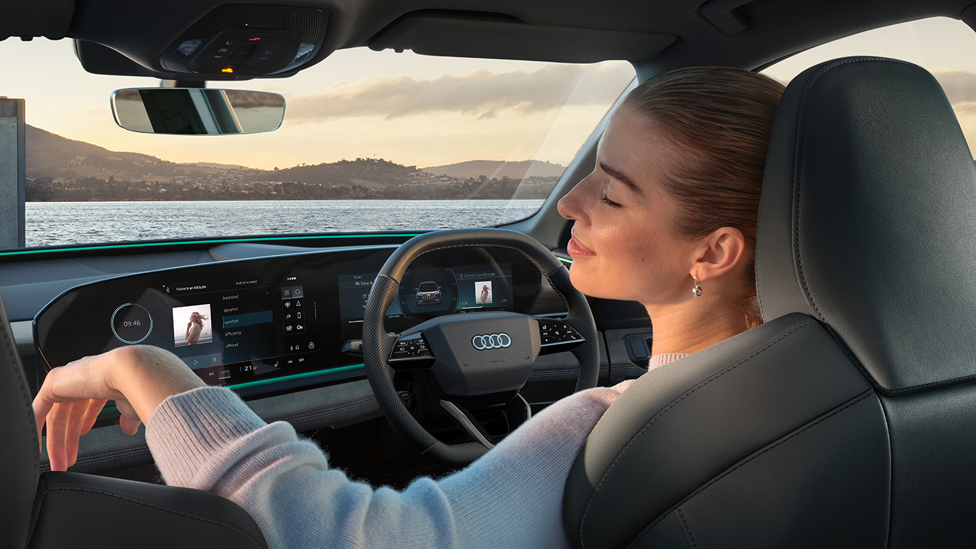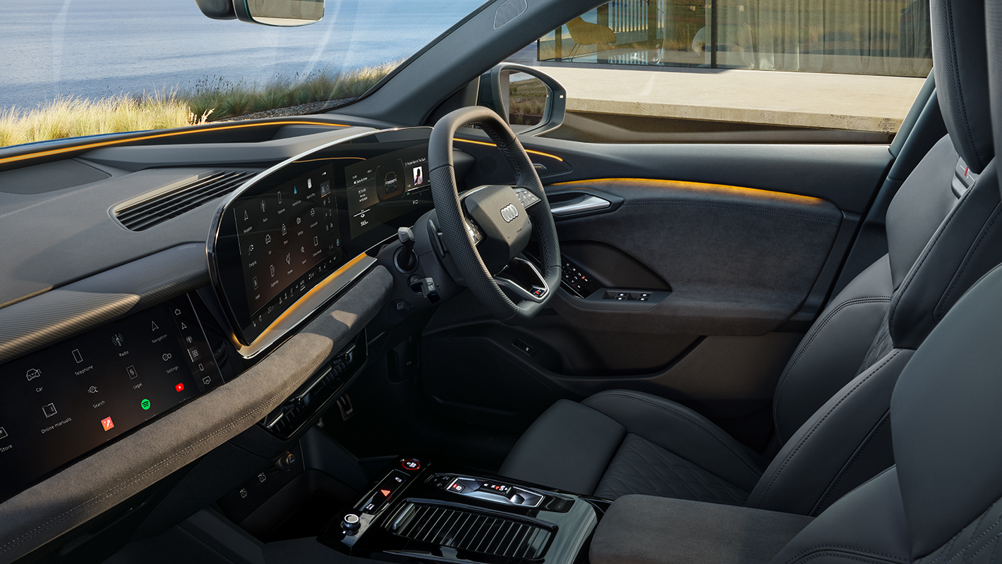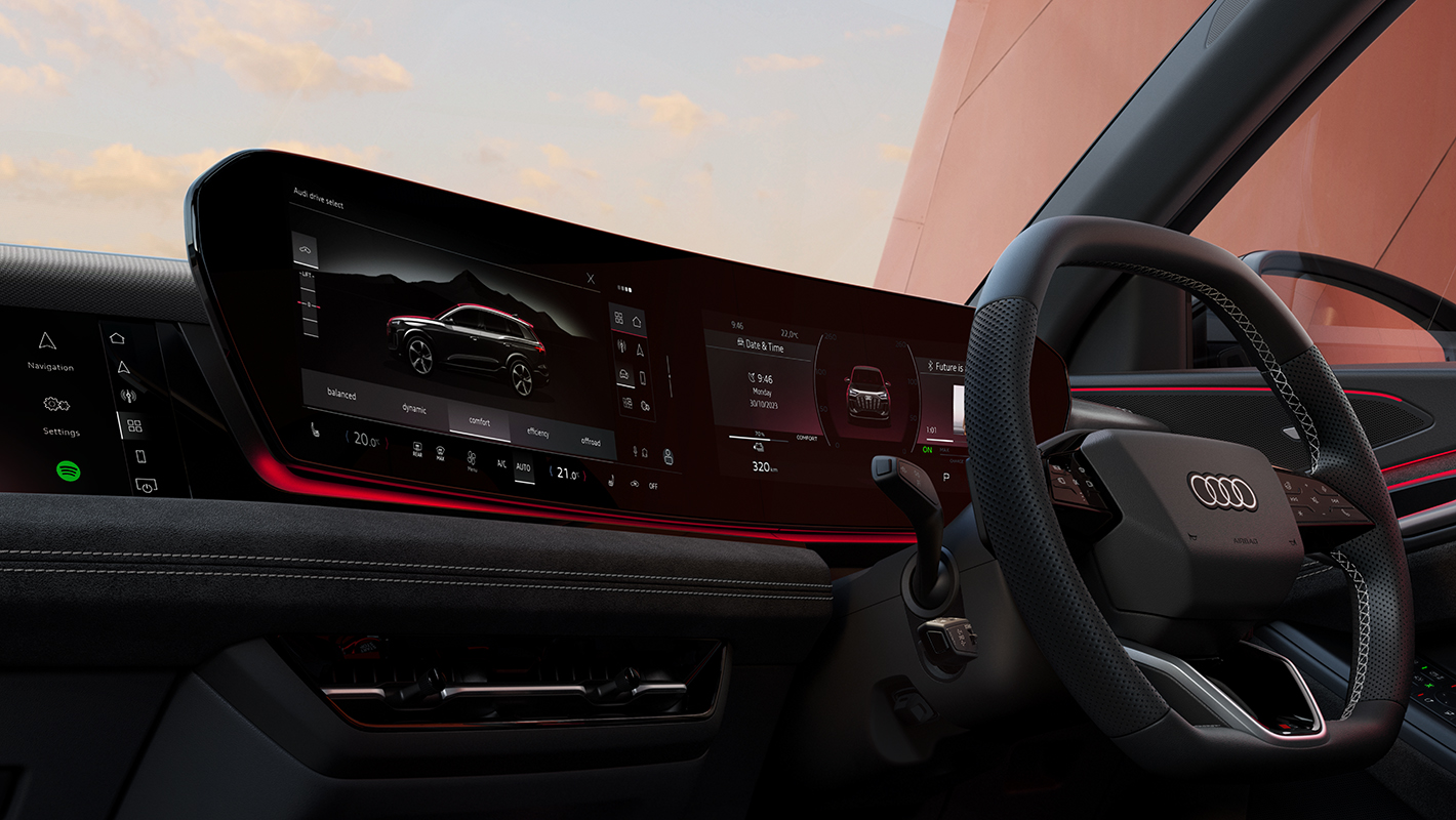 立体的にデザインされたダッシュボードに統合された彫刻的な造形のディスプレイが鮮烈なデジタル体験を叶えるコックピット。フラットトップ&ボトムのステアリングホイールや湾曲したデザインでドライバーに向けて傾けられたMMIパノラマディスプレイ、フロントウィンドウに車速やナビゲーション指示などを景色に重ねて投影できるARヘッドアップディスプレイがドライビングへの集中を高めます。先進のデジタルステージとスポーティネスが美しく融合する空間が、Audi SQ6 e-tronのパフォーマンスを引き立てます。