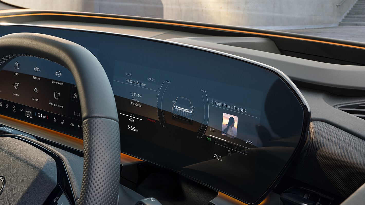 OLED技術を採用した11.9インチディスプレイ。画面中央の円形メーターに走行速度、センサーが検出している周囲の車両と走行レーンの状況、ドライバーアシスタンス機能の作動状況、ナビゲーション指示、充電状況などを表示。画面左右に車両ステータスやメディア情報、エネルギー回生システムを表示します。VIEWボタンで円形メーターの表示/非表示を切り替えできます。