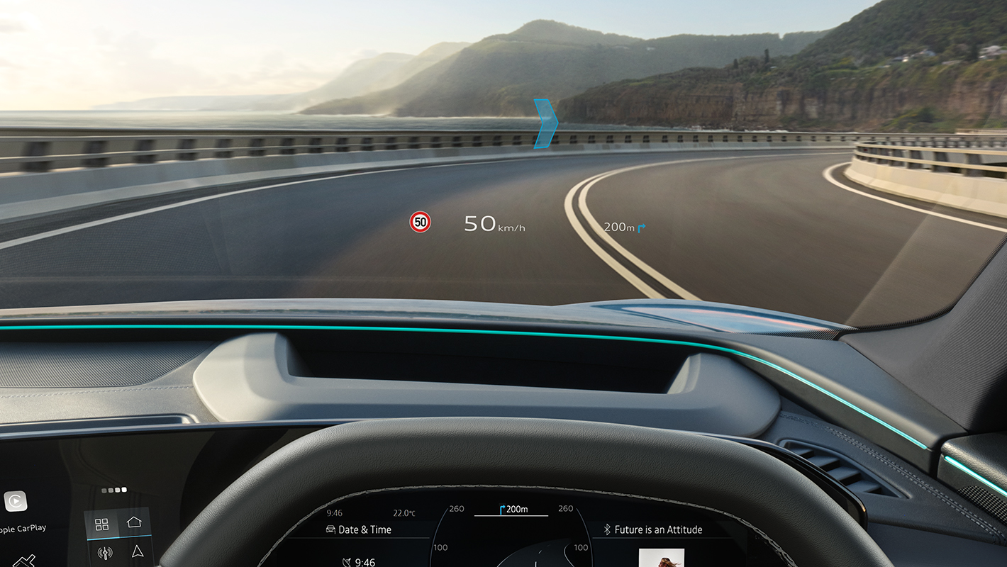 ドライバー正面のフロントウィンドウ上に奥行きのある仮想画像を投影し、実際の景色と融合しているような印象を与えるAR (拡張現実)ヘッドアップディスプレイ。投影サイズは約88インチで、車両から最大200m先に浮かぶように車速、アシスタンスシステムに関する情報、ナビゲーションの指示、警告などを表示します。
