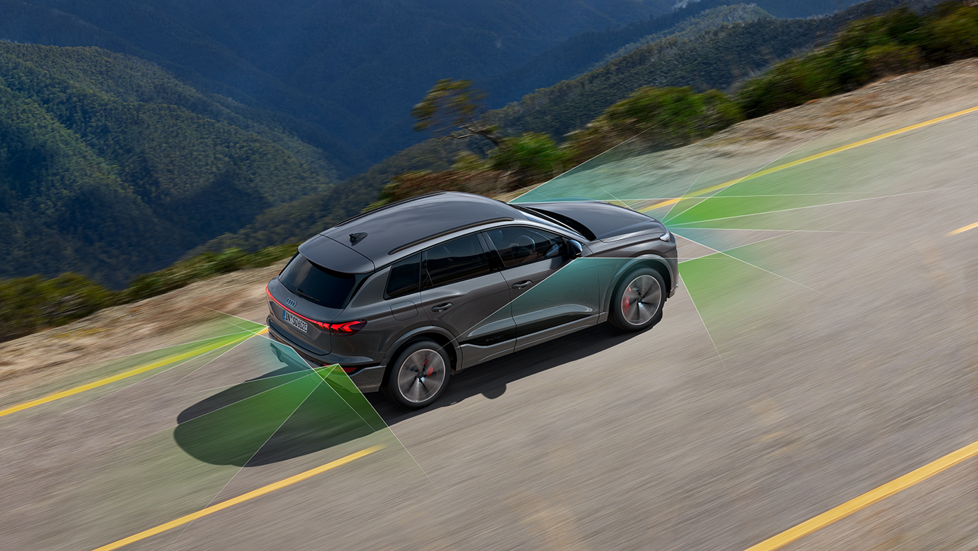Audi SQ6 e-tronは、多彩な先進技術を組み合わせた、繊細なアシスタンスシステムを搭載。長距離の運転をサポートするアダプティブクルーズコントロールや衝突の回避支援、被害を軽減するフロントエマージェンシーブレーキアシスト、駐停車をサポートするパークアシストプラスなどを標準装備。快適性と安心感に包まれたドライビング体験をお届けします。