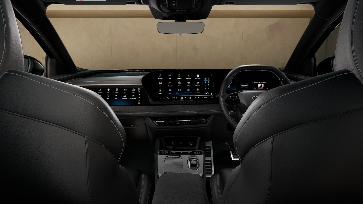 ダイナミックなフォルムに、上質なゆとりと快適性が息づいた広々とした居住空間。室内はエレガントなインテリアに革新的なデジタルテクノロジーが融合。全体を黒く引き締めた空間に、Audi SQ6 e-tronのスポーティなキャラクターを主張する、Sロゴが刻まれたレザーのスポーツシートやマットブラッシュトアルミニウム アンスラサイトのデコラティブパネル、フラットトップ&ボトムのステアリングホイールを標準装備。オプションにはさらなる上質感を堪能できるファインナッパレザーのSスポーツシート*やカーボンツイルマイクロストラクチャー*のデコラティブパネルをご用意。上質さの中にスポーティなEVドライビングを予感させる数々のディテールに満ちています。