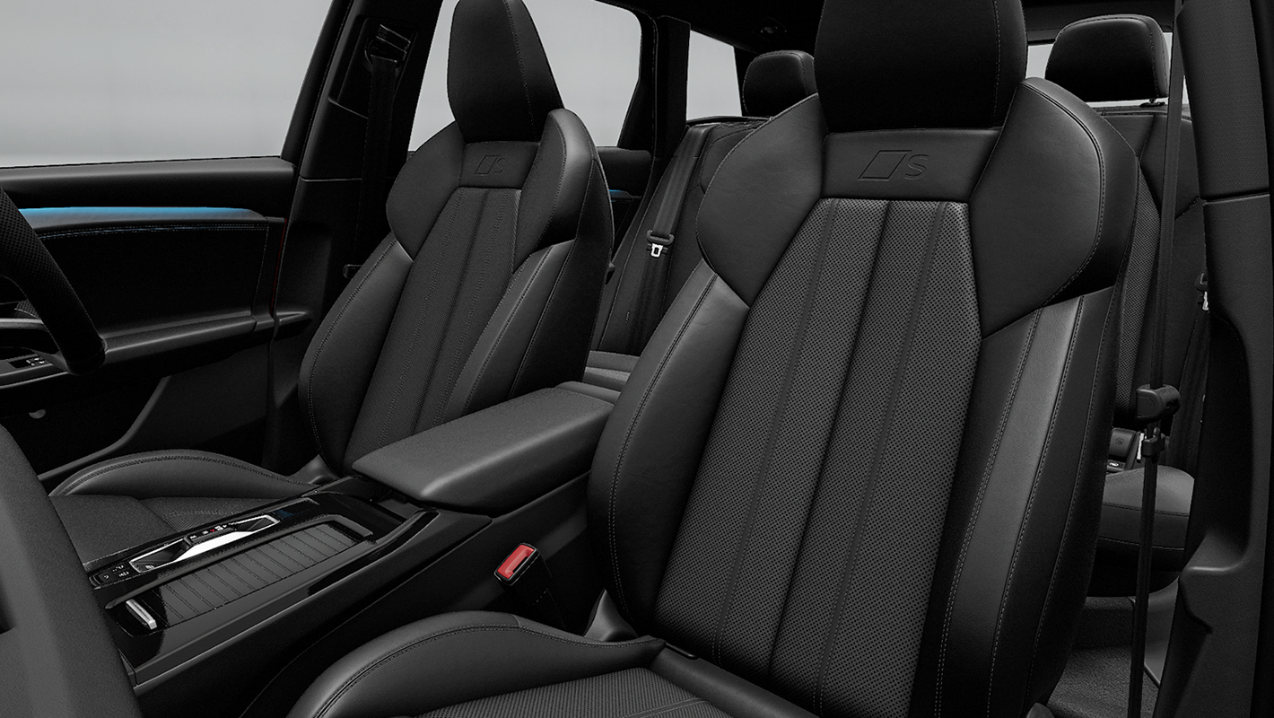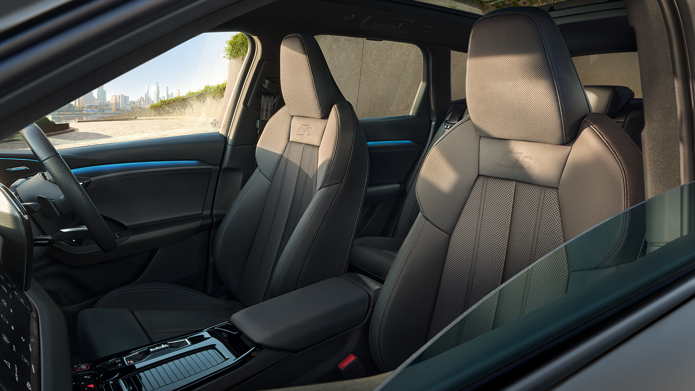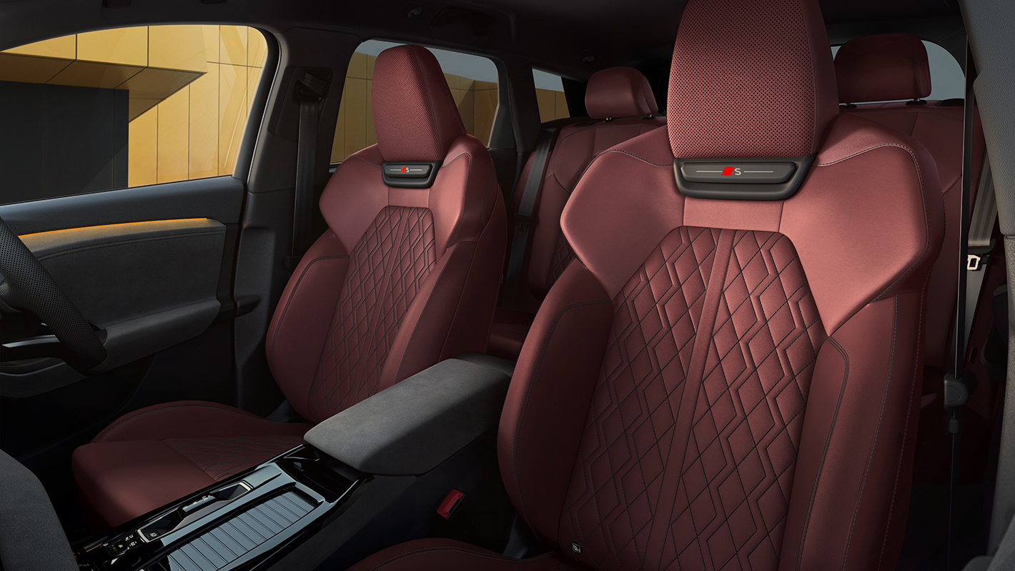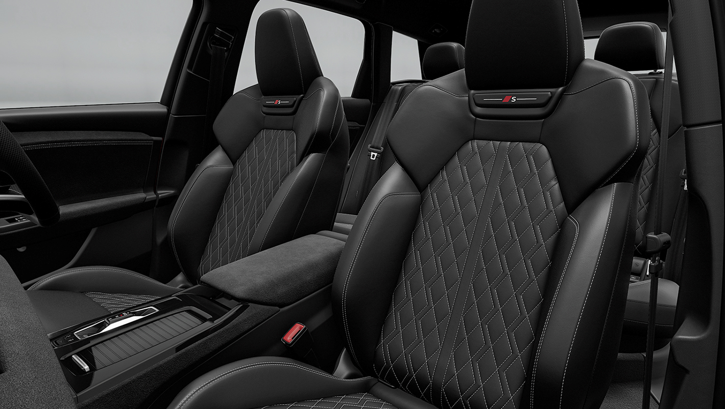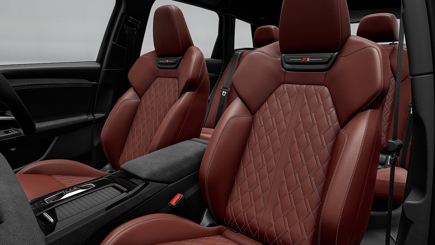 一体型ヘッドレストを備えたホールド性の高いスポーツシート。シートサイドボルスターはコーナリングの際、身体をしっかりサポートする形状に。マッサージ機能も備えています。バックレストのSロゴ、上質で温かみのあるファインナッパレザー、コントラストのある印象的なダイヤモンドステッチが、スポーティでエレガントな雰囲気を際立たせます。