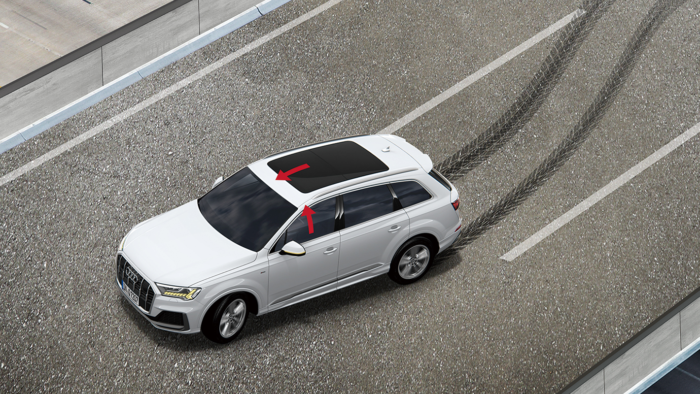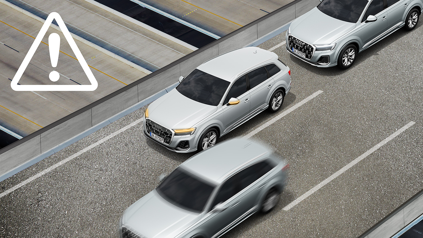 運転中およびアクティブレーンアシストの作動中にドライバーの反応がなかった場合に表示や音などで警告。危険を察知しシステムの限度内で反応しなければ、システムがクルマのコントロールを引き受け、走行レーン内に自動で停止させます。アウディプレセンスを起動させ、乗員のレスキューに備え、自動でエマージェンシーコールにつなぎます。