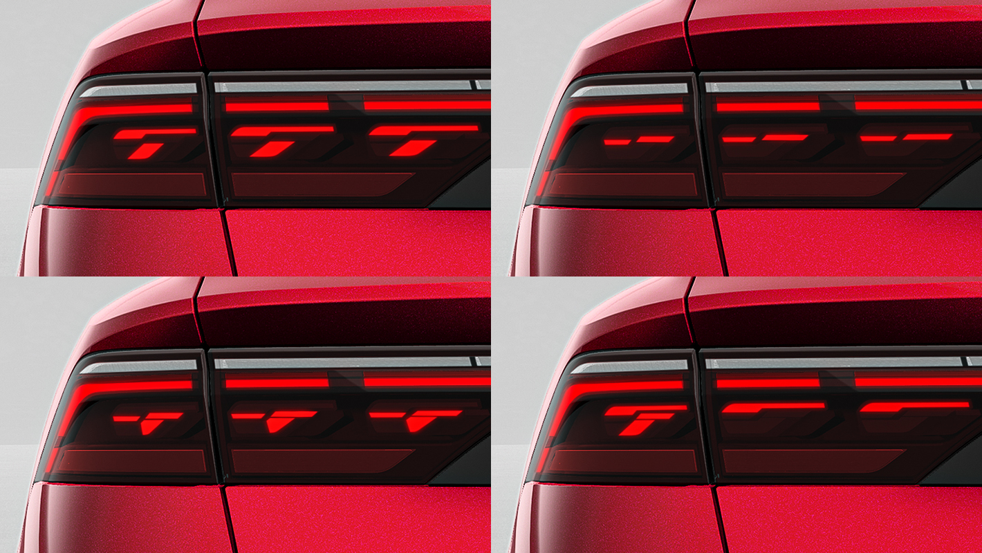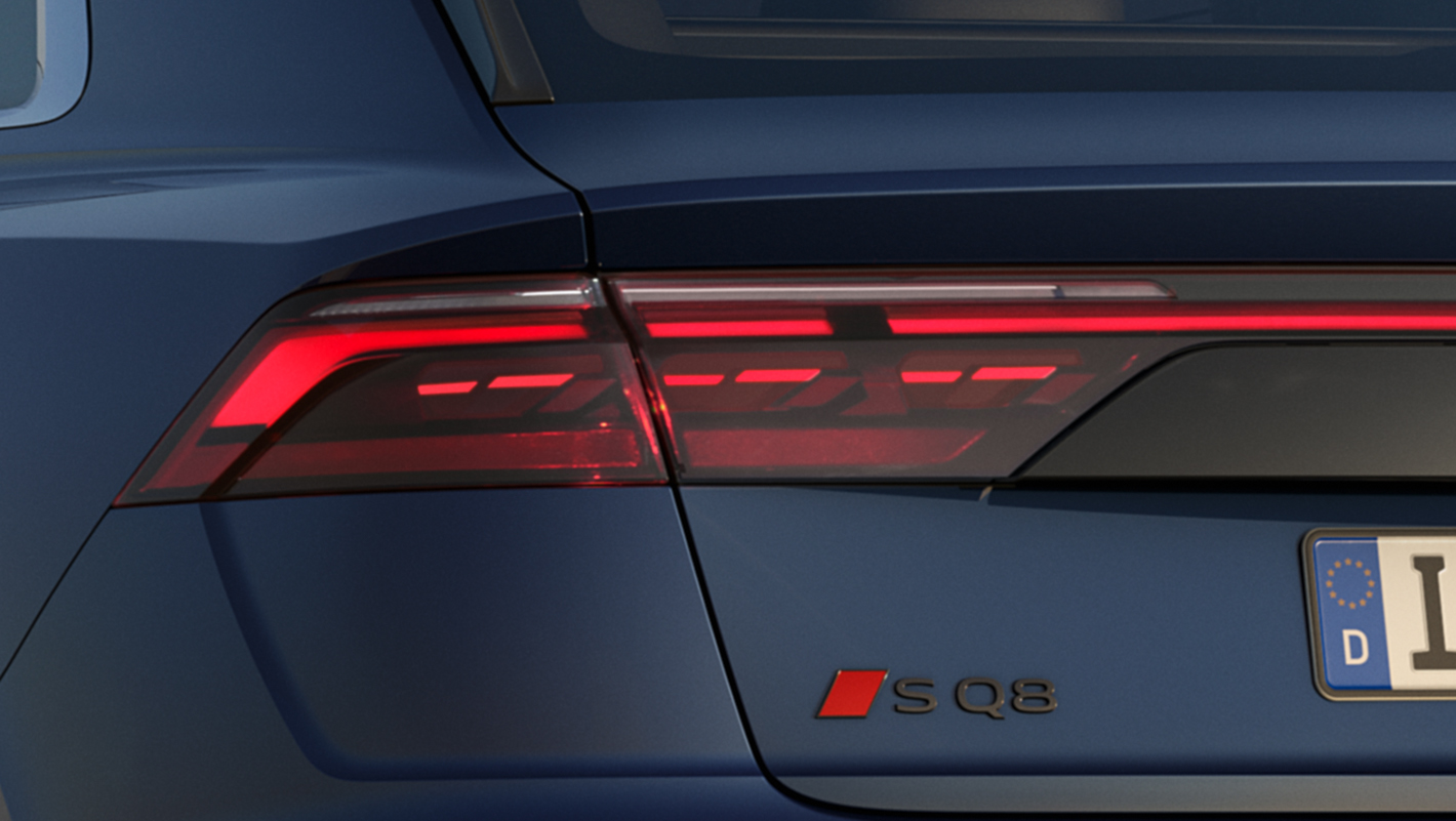 革新的なOLED (有機発光ダイオード)によって、省電力で軽量、基板そのものが面全体で発光し、均一な照明、高い視認性そして斬新なライティングデザインを生み出します。微細な3次元のセグメントに分割できるOLEDにより、特徴的な発光パターンが可能になりました。MMIタッチディスプレイで4つの点灯パターンを切り替え可能。停車時に後続車が2m以内に近づくとすべてのOLEDセグメントを点灯させることで車間距離の確保を警告します。