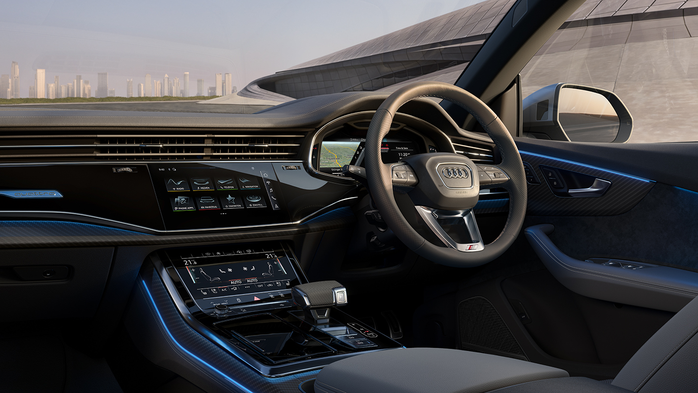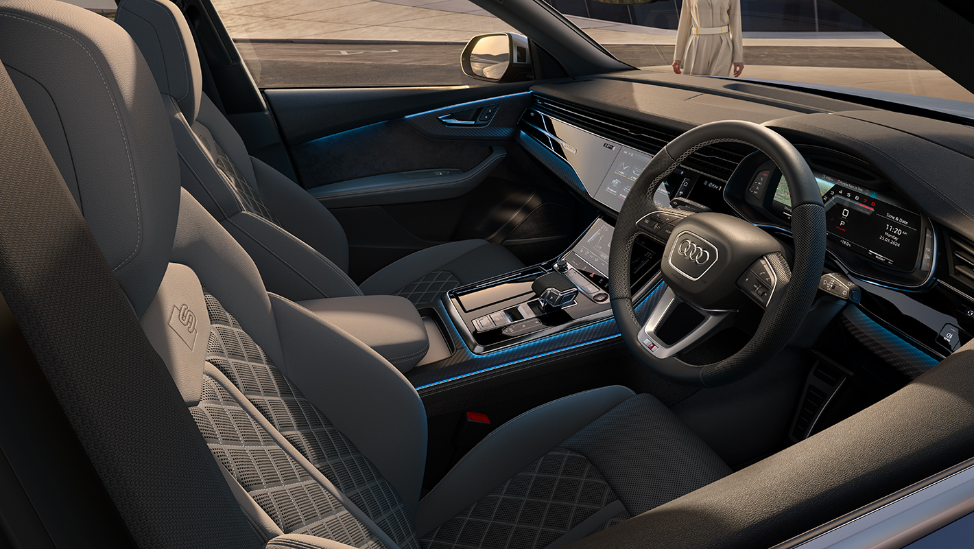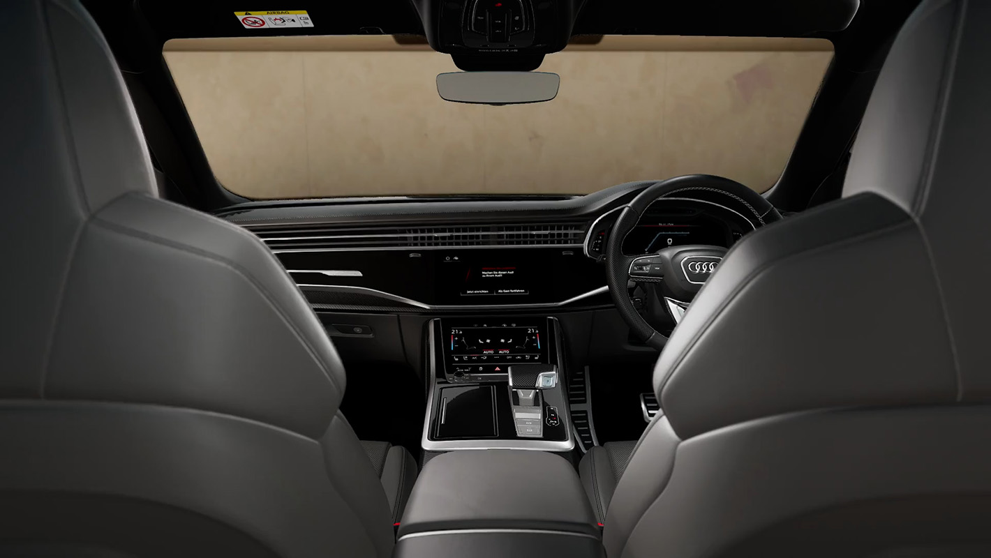 心躍らせるデザイン、ラグジュアリーな装備、インテリジェントなテクノロジーが融合したAudi SQ8のインテリア。ダイナミカ/レザーを標準装備したスポーツシートは、刺激的なドライビングの高揚感とこの上ない寛ぎ、どちらも存分に堪能できる空間を演出します。オプションでエレガントなバルコナレザーで仕立てたSスポーツシートもご用意。