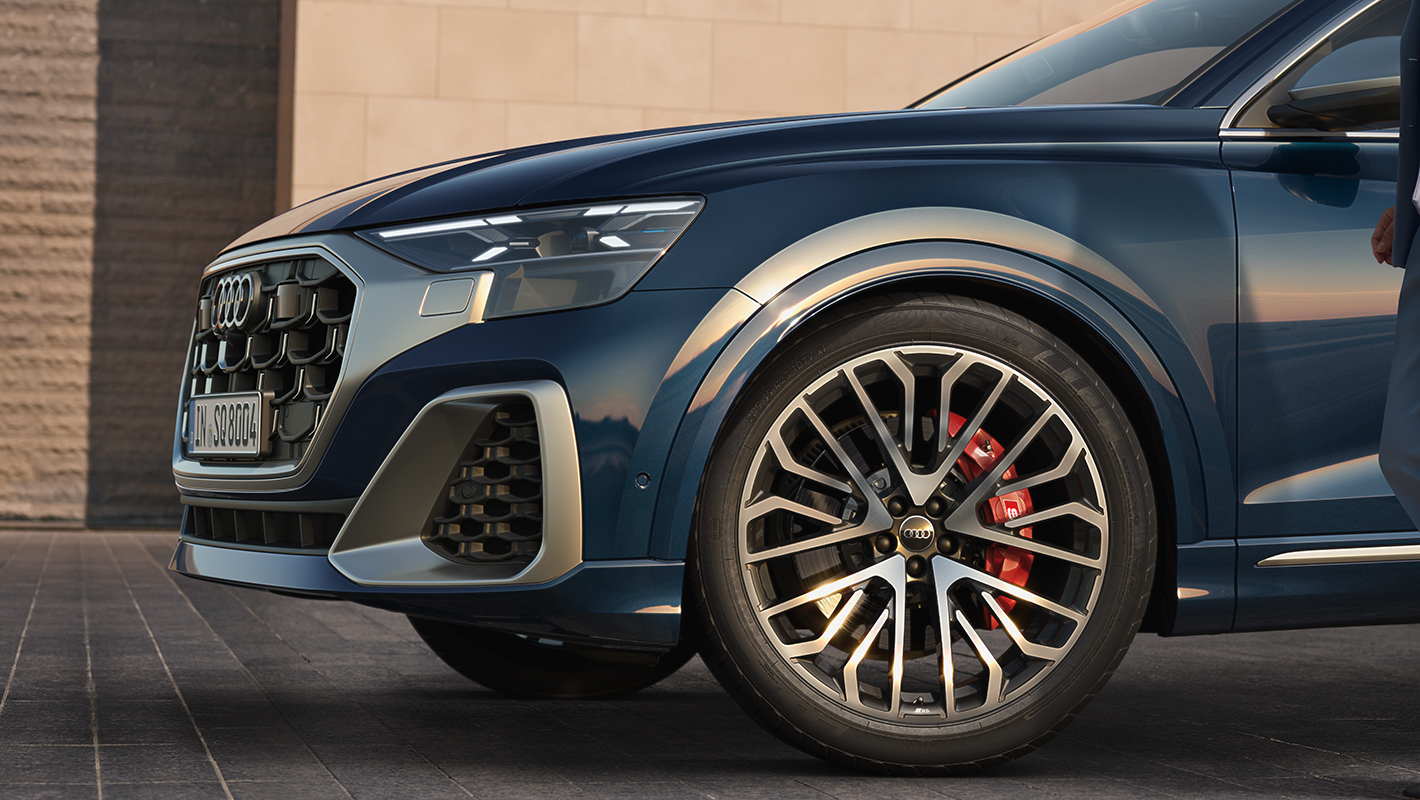 足元にはブラックメタリックポリッシュトのマルチスポークSデザイン23インチアルミホイール*をご用意。quattro®を主張する筋肉質なホイールアーチと共にパワフルなパフォーマンスを体現します。