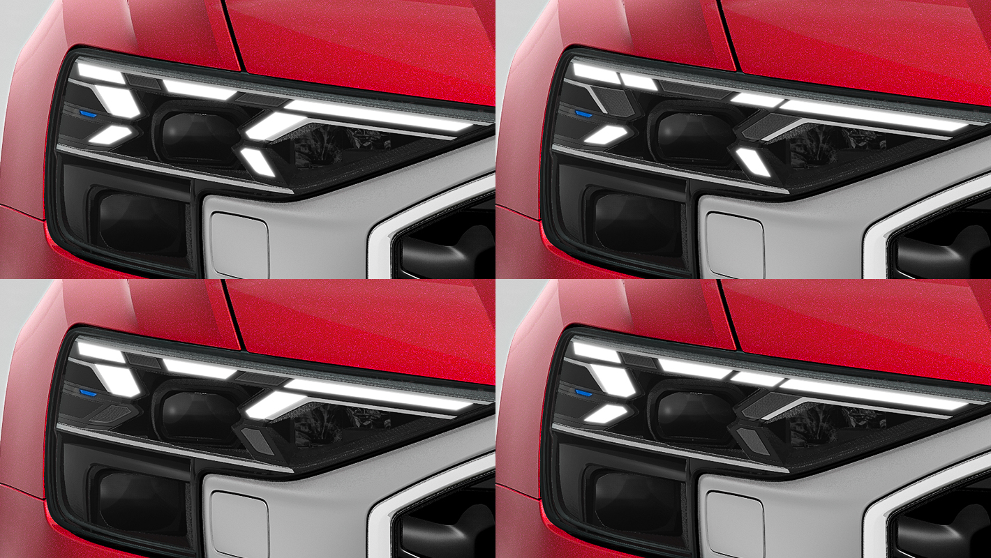 アウディレーザーライトを備えたHDマトリクスLEDヘッドライトは先進のライティングテクノロジーを印象的に視覚化。高解像度なLEDと高出力のレーザーライトで道路をシャープかつ正確に照らします。さらに4つの点灯パターンからお好みのデザインにカスタマイズできるデジタルデイタイムランニングライトも搭載。
