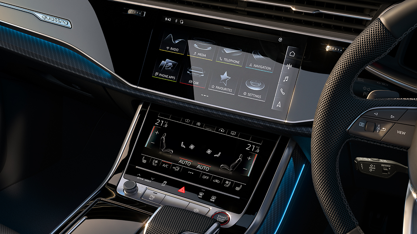 デジタル時代にふさわしいユーザーインターフェースであるMMIタッチレスポンスは、フラットな高解像度モニターで車両のセッティングやインフォテインメントを直感的に操作することが可能。グラフィックや振動、音によって、視覚、触覚、聴覚に明確な反応を感じ取れます。インフォテインメント用の10.1インチアッパースクリーンと、空調操作や手書き文字入力用の8.6インチローワースクリーンの2つのタッチディスプレイを搭載。イグニッションをOFFにするとスクリーンが漆黒のフラットなブラックパネルとなり、周囲のインテリアに溶け込みます。