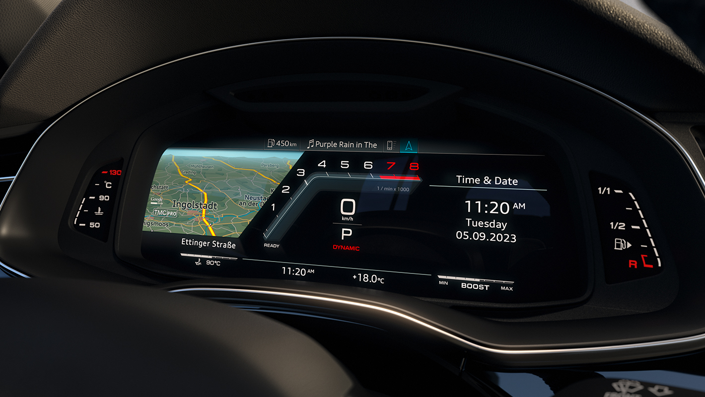 高解像度12.3インチカラー液晶フルデジタルディスプレイに、スピードメーター、タコメーター、マップ、ラジオ/メディア情報などをフレキシブルに表示。操作はマルチファンクション付きステアリングホイールからダイレクトに行えます。レイアウトは「スポーツ」、「ダイナミック」、「Sパフォーマンス」から選択できます。またVIEWボタンを押すことでメーターの大小切り替えも可能。メーター表示を小さくすれば、オンボードコンピューターやMMIナビゲーションのコンテンツ、3D地形図などをより見やすく画面の広いエリアに表示できます。
