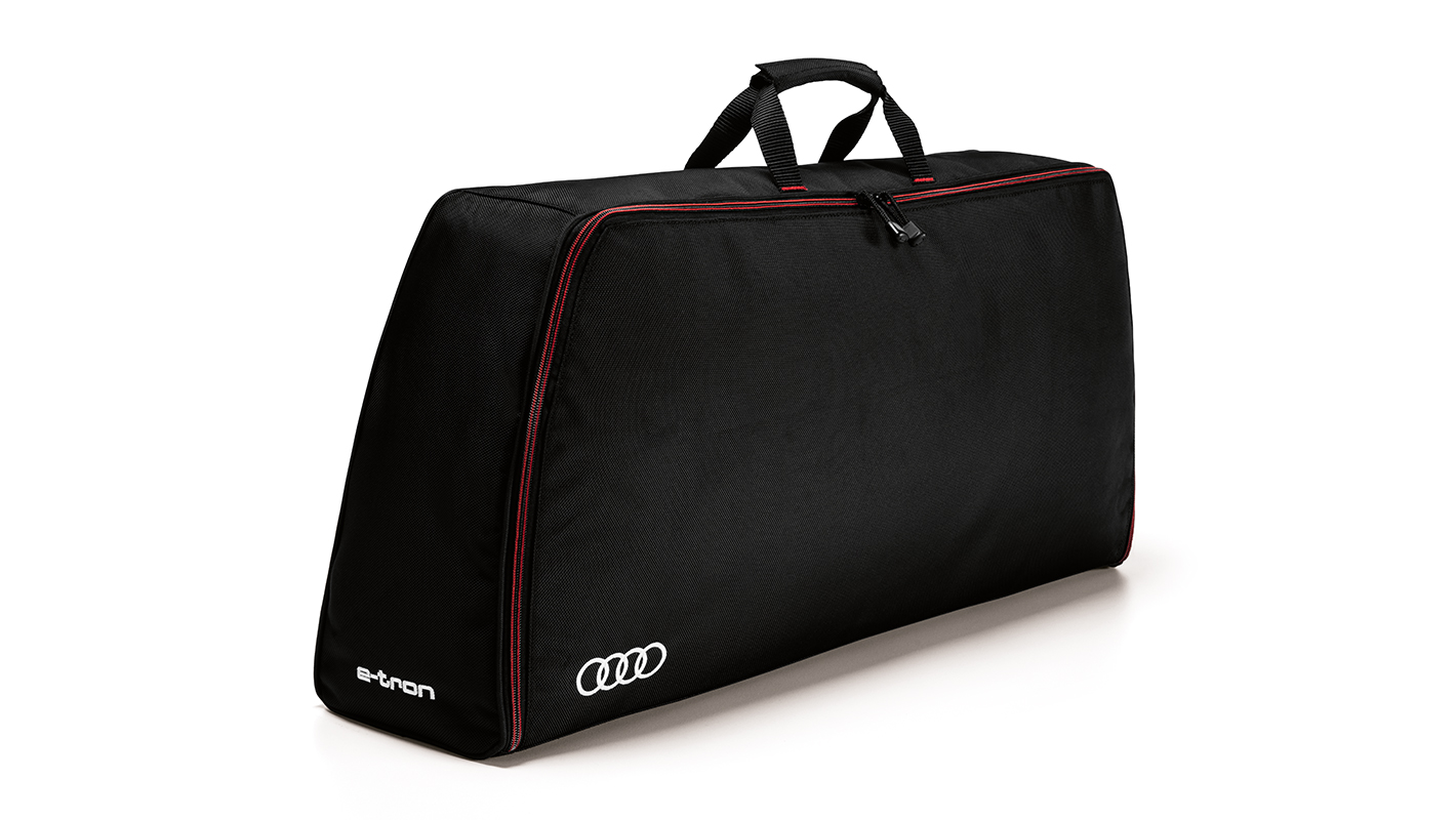 充電ケーブルを安全に収納できる専用バッグ。フロントトランクルームのケーブル収納スペースにジャストフィットし、出し入れが便利です。「e-tron」ロゴ、「フォーリングス」ロゴがデザインされています。