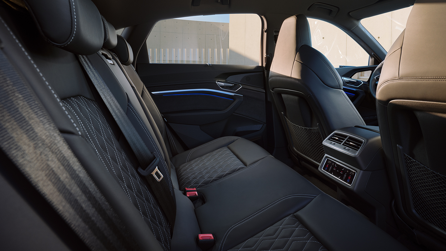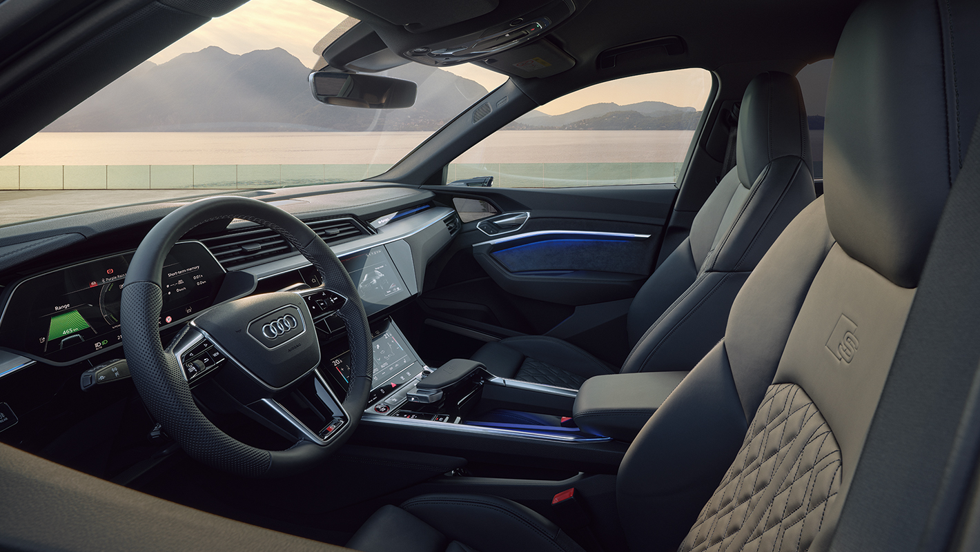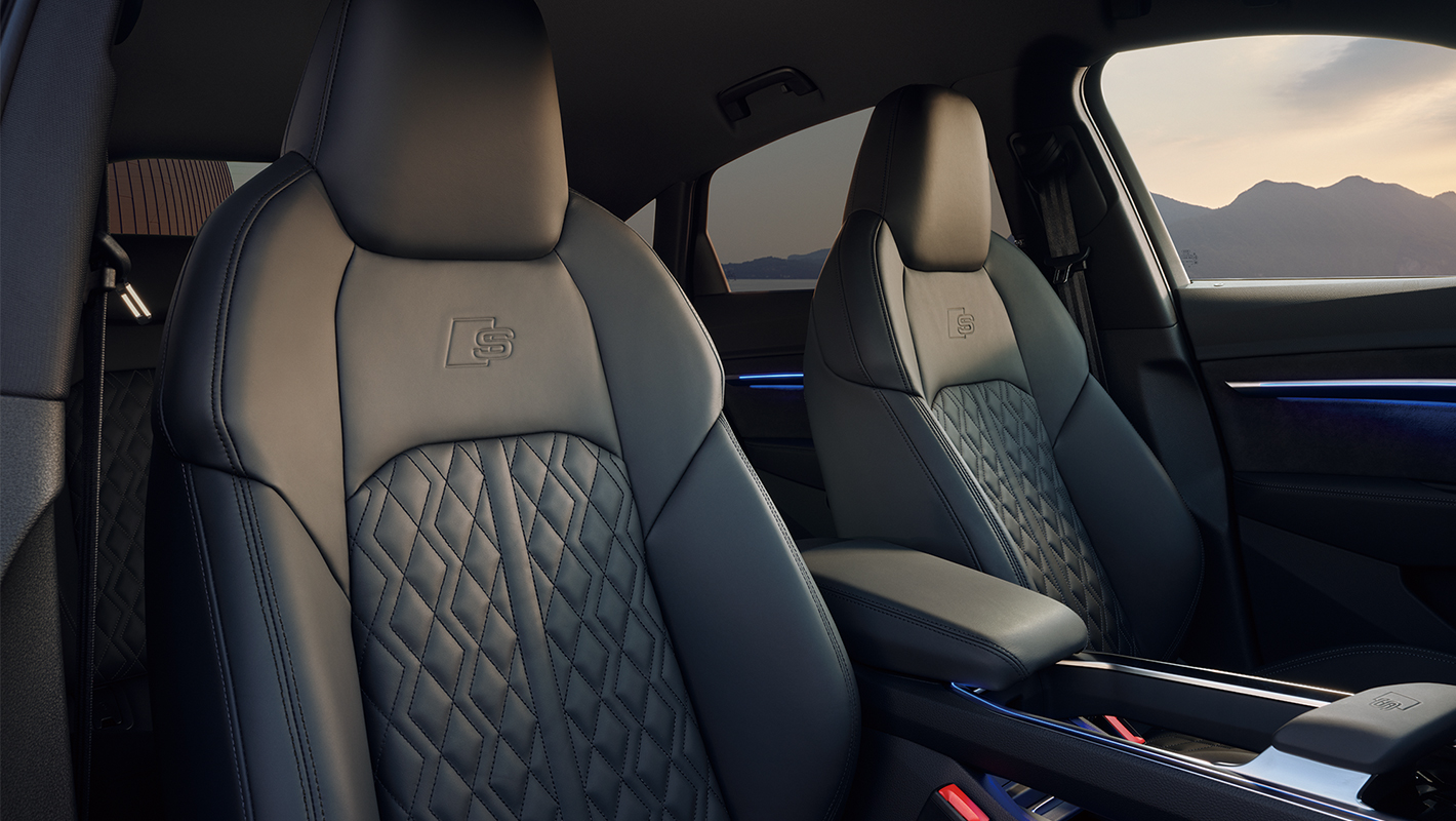 卓越したパフォーマンスを堪能する室内空間は、スポーティなスタイルを磨き上げた装備とフラッグシップ電動SUVならではの上質なマテリアルが調和しています。ブラックを基調としたインテリアに彩りを添えるのは、Sエンブレム付きのステアリングホイールやSロゴをあしらったドアシルトリム、クールな雰囲気を醸し出すマットブラッシュトアルミニウム ダークのデコラティブパネル。上質なバルコナレザーを使用し、精緻なダイヤモンドステッチを施して丹念に仕上げられたSスポーツシートは、優れたホールド性でクルマとの一体感を演出します。また、S専用ビューを備えたバーチャルコックピットプラスやMMIタッチレスポンスディスプレイなど、快適な運転環境をサポートするデジタルテクノロジーも充実。