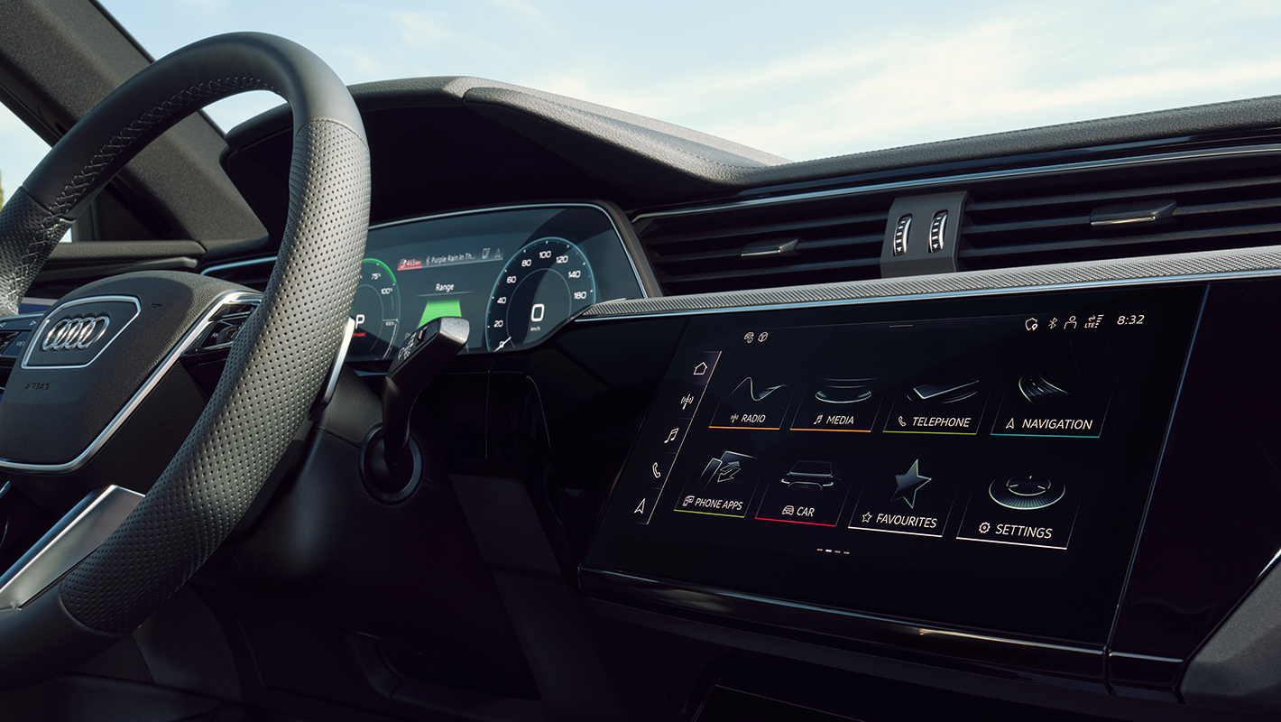 高解像度12.3インチカラー液晶フルデジタルディスプレイに、ドライバーに必要な情報を目前に表示。レイアウトは「e-tron」、「スポーツ」、「クラシック」から選択できます。またVIEWボタンを押すことでメーターの大小切り替えも可能。ナビゲーション、アシスタンスの稼働状況などに加え、充電や回生システム、EV走行などの情報を、目線を前方からそらさずに確認できます。MMIナビゲーションとは異なる地図の縮尺、設定で表示ができます。