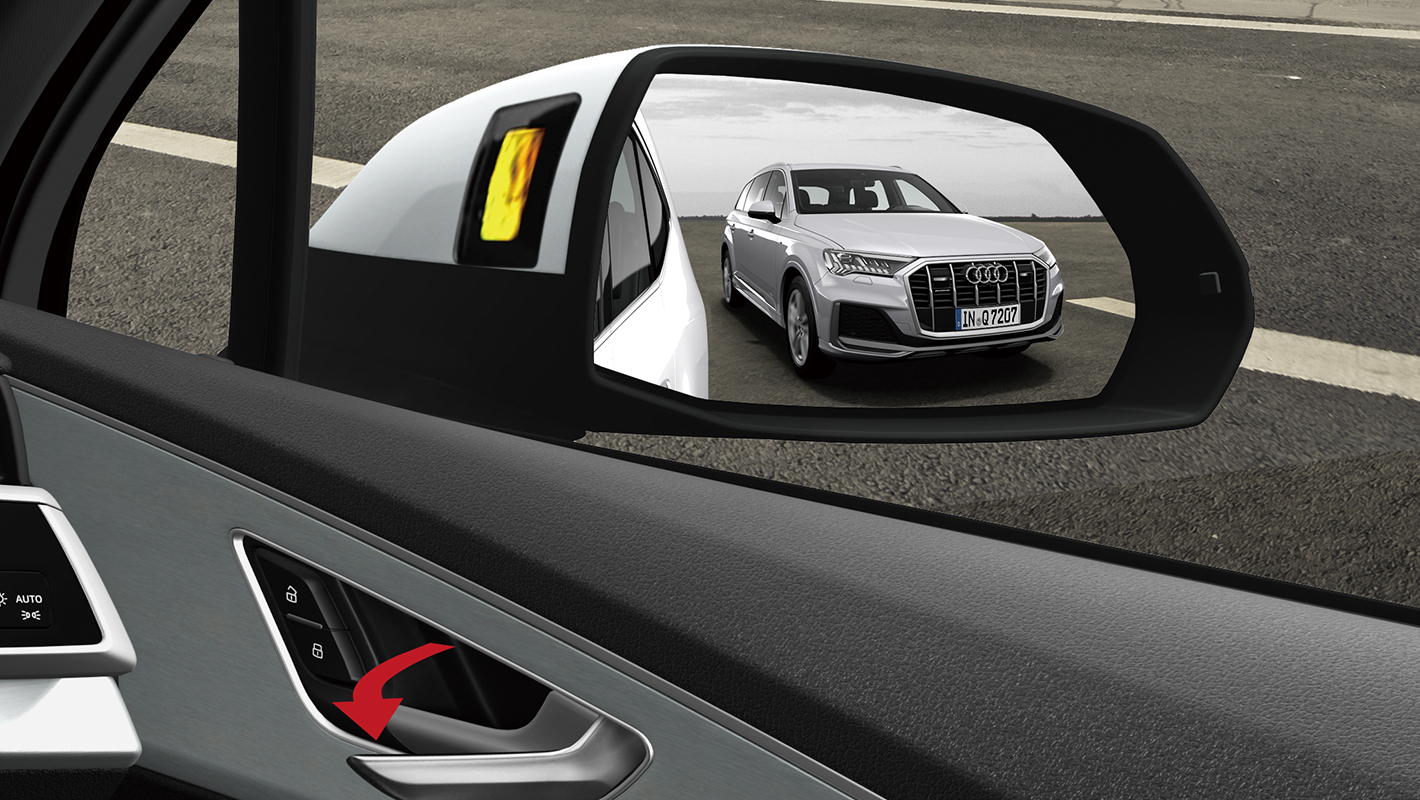 システムがレーダーセンサーを用いて後方に迫る車両を監視。クルマの停車時にドアを開ける時、後方から近づく車両と衝突する危険がある場合、乗員に注意喚起を行います。ドアのハンドルをひくと、ドアのストリップライトとエクステリアミラーのLED表示が点灯し警告します。