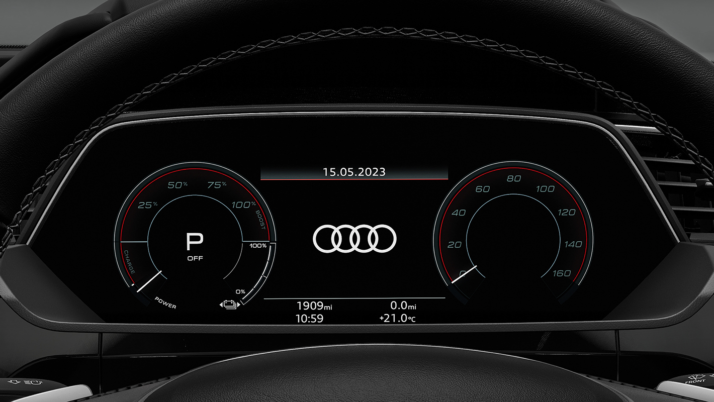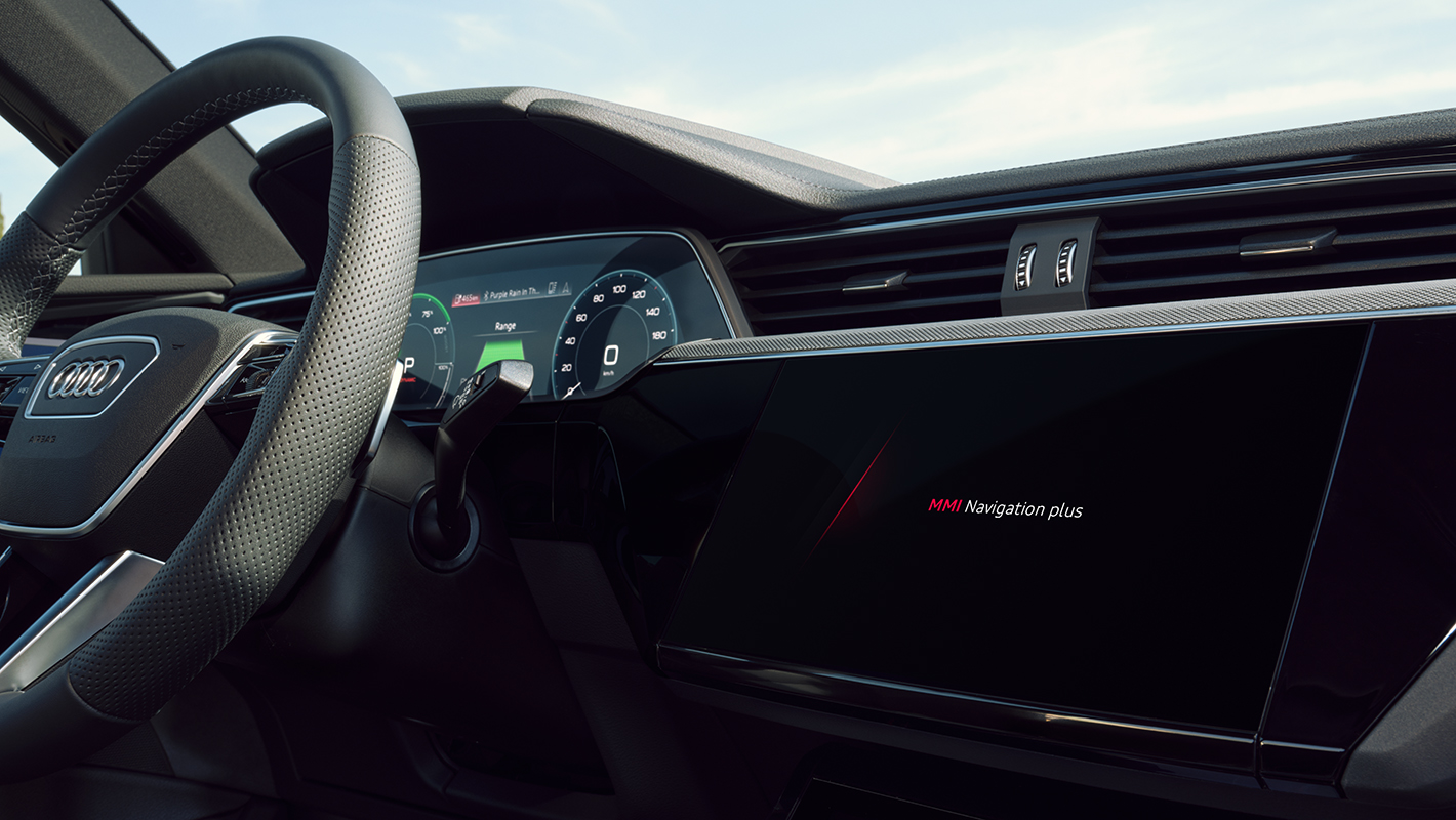 高解像度12.3インチカラー液晶フルデジタルディスプレイに、ドライバーに必要な情報を目前に表示。レイアウトは「e-tron」、「スポーツ」、「クラシック」から選択できます。またVIEWボタンを押すことでメーターの大小切り替えも可能。ナビゲーション、アシスタンスの稼働状況などに加え、充電や回生システム、EV走行などの情報を、目線を前方からそらさずに確認できます。MMIナビゲーションとは異なる地図の縮尺、設定で表示ができます。